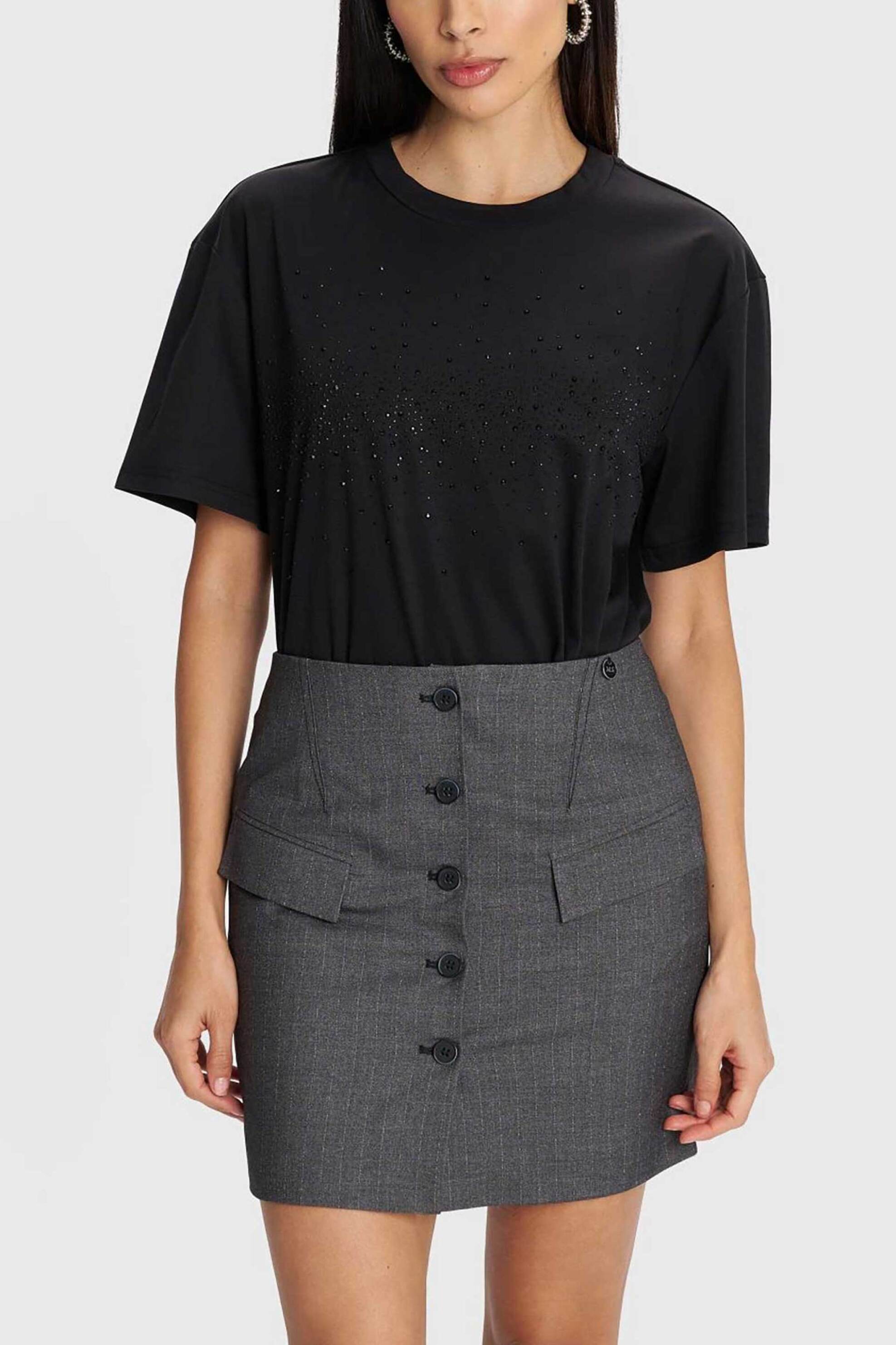 Γυναικεία mini φούστα. Ριγέ σχέδιο. Διακοσμητικές τσέπες στο μπροστινό μέρος. Kλείσιμο με κουμπιά. Προέλευση: Κίνα. 70% polyester, 28% βισκόζη, 2% elastane Το μοντέλο έχει ύψος 174 cm και φοράει μέγεθος S. AXF Α.Ε. ΕΝΔΥΜΑΤΩΝ ΥΦΑΣΜΑΤΩΝ