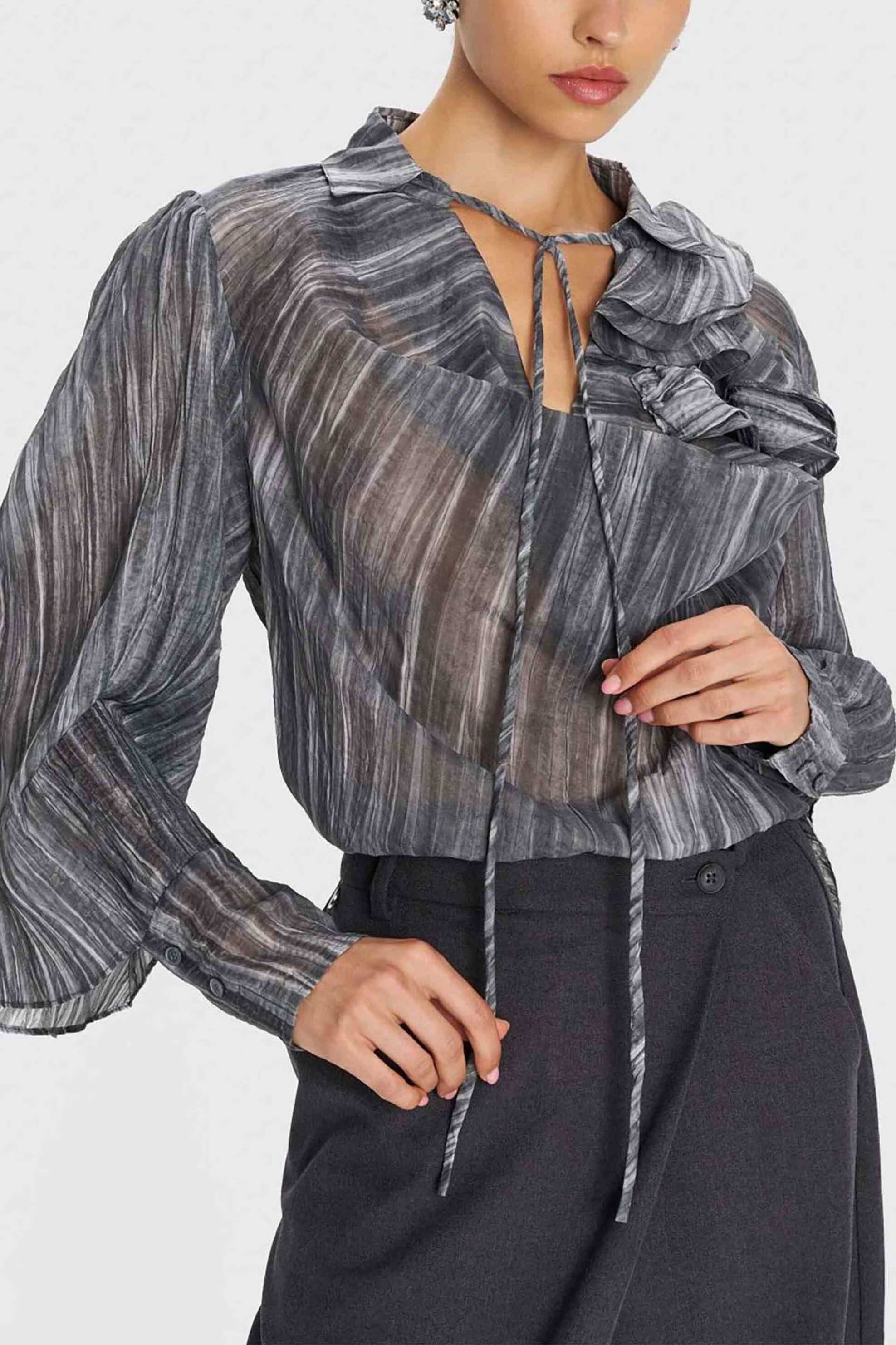 Γυναικεία μπλούζα. Αll-over print. Βολάν στο μπροστινό μέρος. Μακρύ μανίκι. Μανσέτες με κουμπιά. Προέλευση: Κίνα. 100% polyester AXF Α.Ε. ΕΝΔΥΜΑΤΩΝ ΥΦΑΣΜΑΤΩΝ