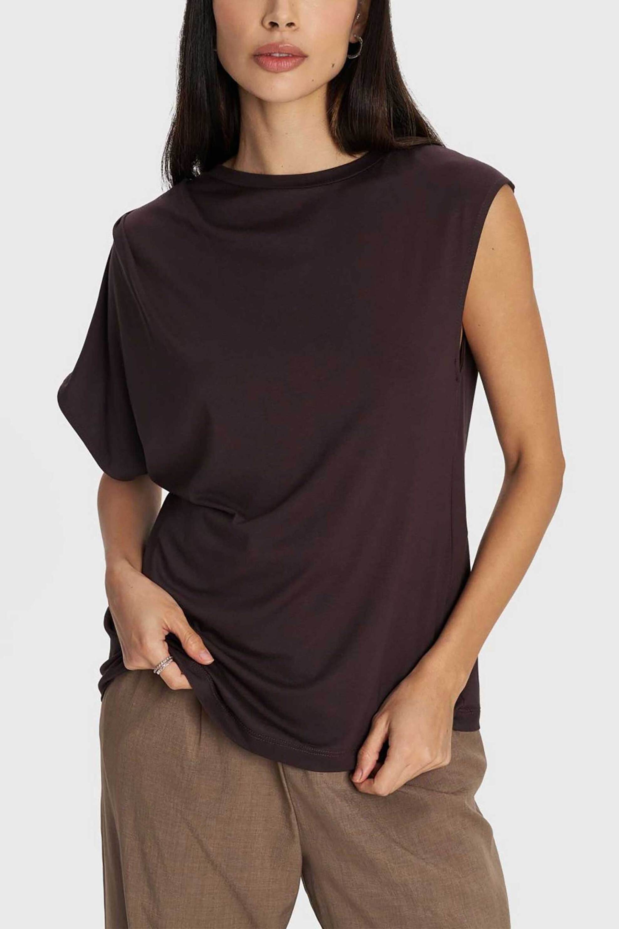 Γυναικεία μπλούζα. Μονόχρωμη. Boat λαιμόκοψη. Ασύμμετρα μανίκια. Προέλευση: Ιταλία. 94% βισκόζη, 6% elastane Το μοντέλο έχει ύψος 174 cm και φοράει μέγεθος S. AXF Α.Ε. ΕΝΔΥΜΑΤΩΝ ΥΦΑΣΜΑΤΩΝ
