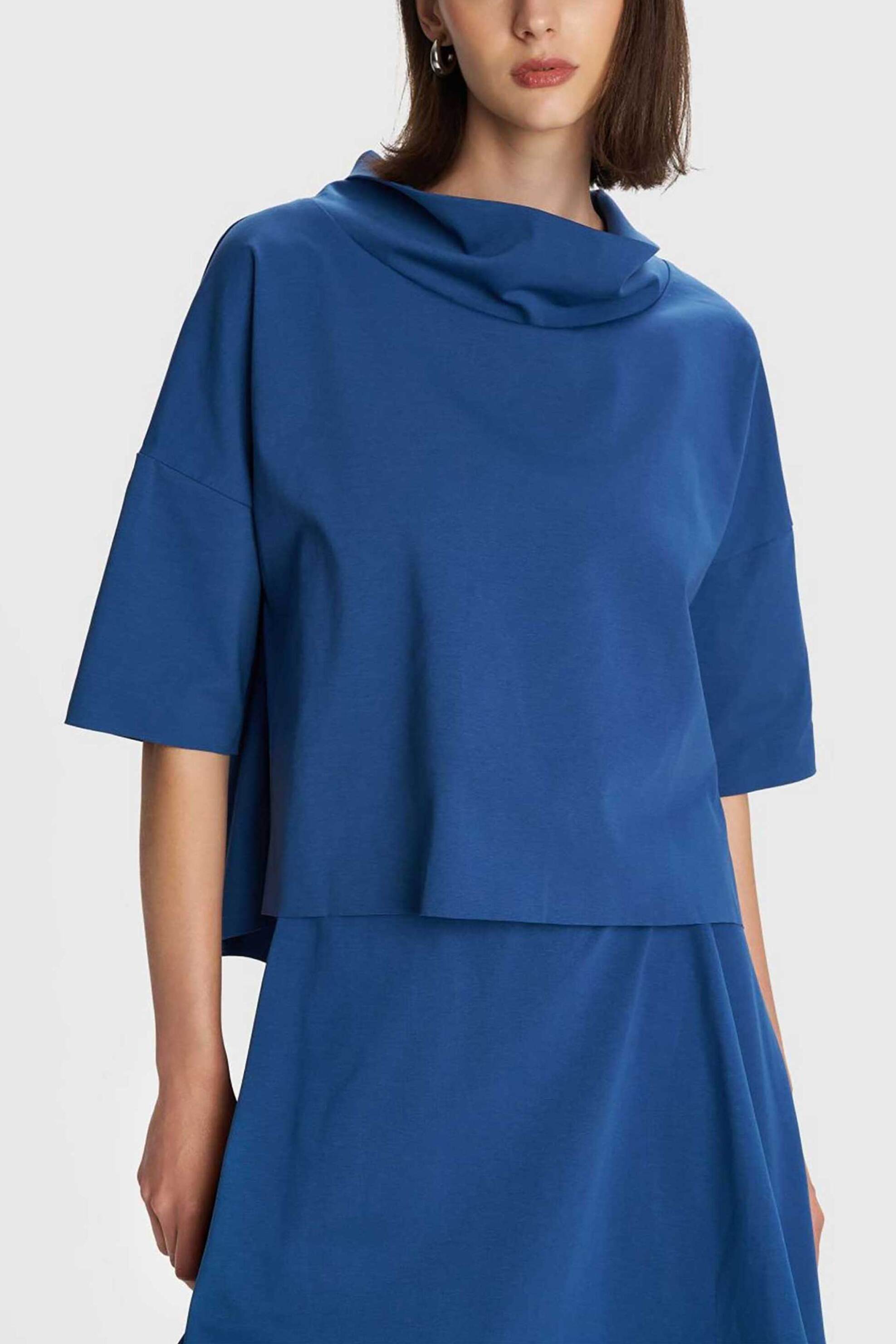 Γυναικεία μπλούζα. Μονόχρωμη. Ασύμμετρο τελείωμα. Ψηλός λαιμός. Κοντό μανίκι. Προέλευση: Ιταλία. 52% βαμβάκι, 40% nylon, 8% elastane Το μοντέλο έχει ύψος 179 cm και φοράει μέγεθος S. AXF Α.Ε. ΕΝΔΥΜΑΤΩΝ ΥΦΑΣΜΑΤΩΝ