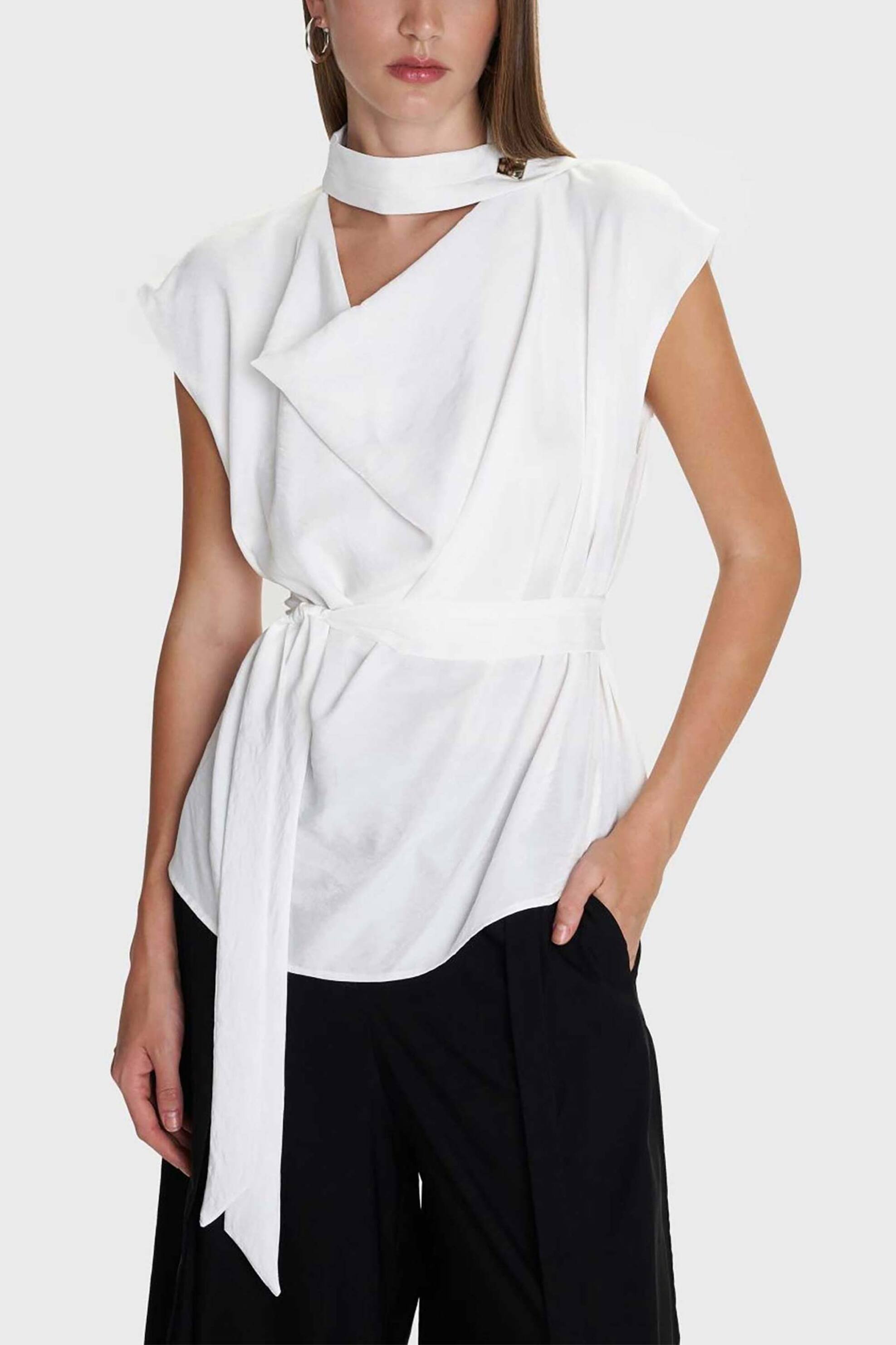 Γυναικεία μπλούζα. Μονόχρωμη. Ιδιαίτερο κλείσιμο με κουμπί στη λαιμόκοψη. Ζώνη στη μέση. Κοντο μανίκι. Προέλευση: Ελλάδα. 54% βισκόζη, 46% polyester Το μοντέλο έχει ύψος 178 cm και φοράει μέγεθος S. AXF Α.Ε. ΕΝΔΥΜΑΤΩΝ ΥΦΑΣΜΑΤΩΝ