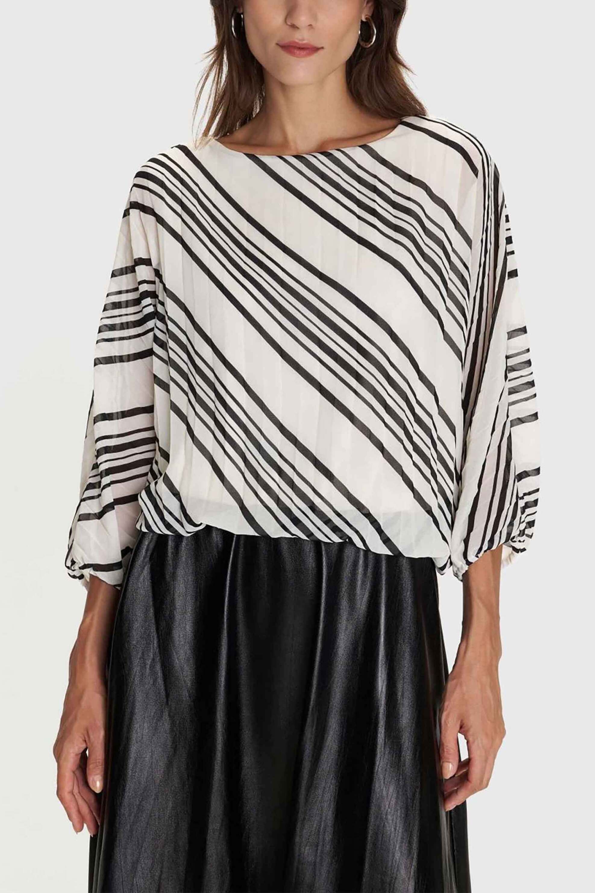 Γυναικεία μπλούζα. Ριγέ σχέδιο. Boat λαιμόκοψη. Mακρύ μανίκι. Κλείσιμο με κουμπί στο πίσω μέρος. Προέλευση: Κίνα. 100% polyester Το μοντέλο έχει ύψος 176 cm και φοράει μέγεθος S. AXF Α.Ε. ΕΝΔΥΜΑΤΩΝ ΥΦΑΣΜΑΤΩΝ