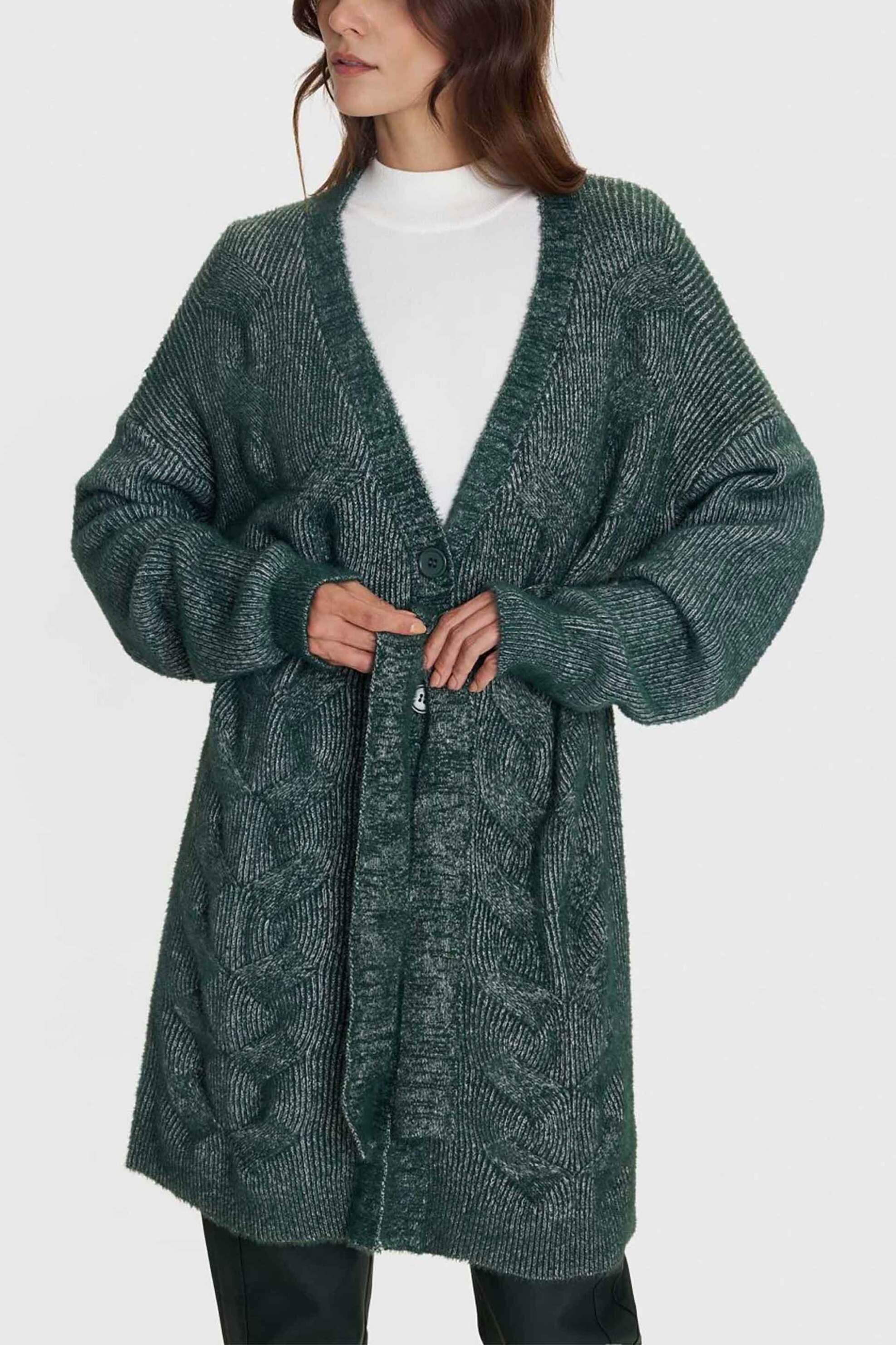 Γυναικεία ζακέτα. Ριγέ σχέδιο. Ελαστική μέση στο πίσω μέρος. Μακρύ μανίκι. Κλείσιμο με κουμπιά. Προέλευση: Κίνα. 73% nylon, 17% acrylic, 10% polyester Το μοντέλο έχει ύψος 176 cm και φοράει μέγεθος S. AXF Α.Ε. ΕΝΔΥΜΑΤΩΝ ΥΦΑΣΜΑΤΩΝ