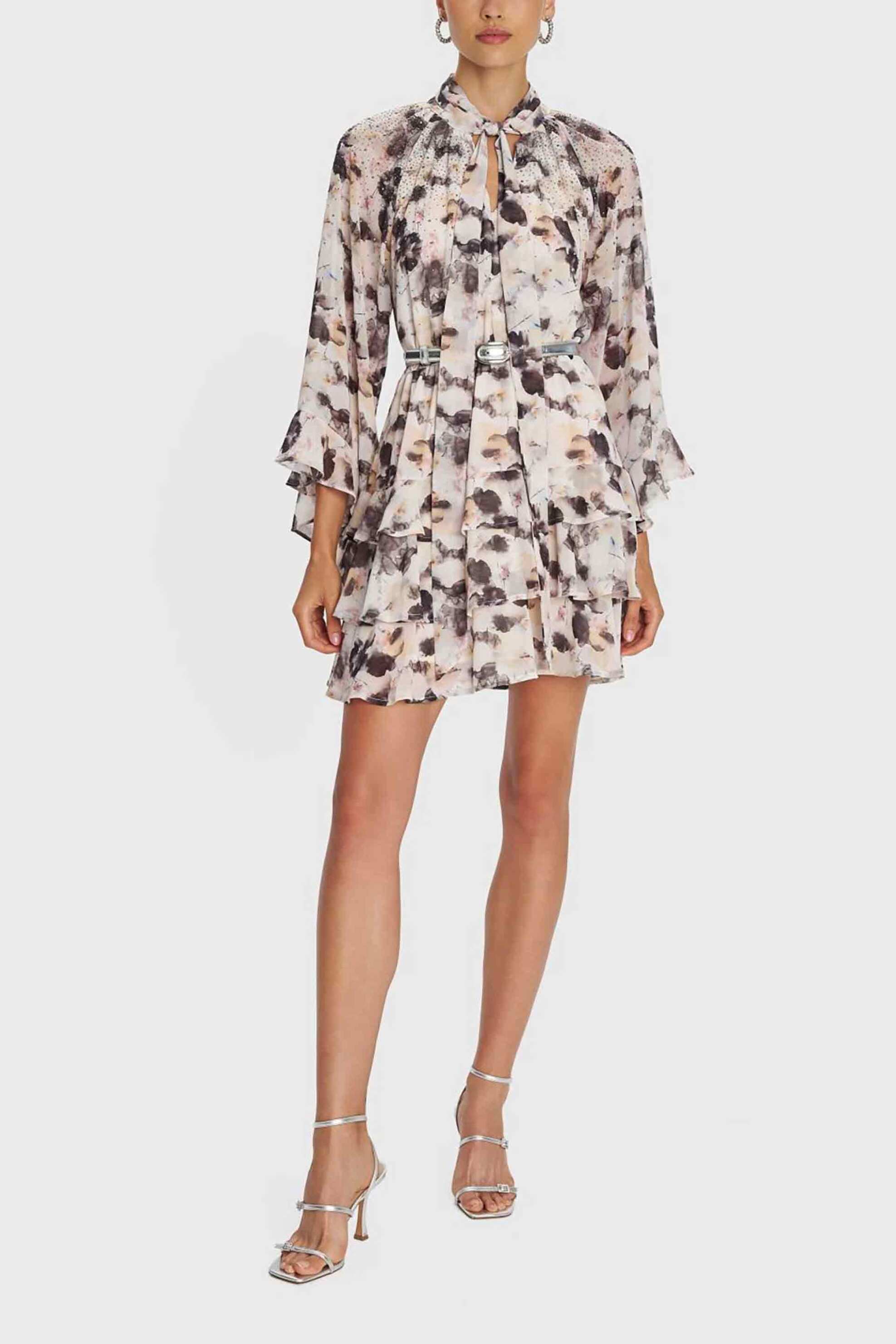 Γυναικείο mini φόρεμα. Floral print. Στρας. Μακρύ μανίκι. Φιόγκος στο λαιμό. Προέλευση: Κίνα. 100% polyester Το μοντέλο έχει ύψος 180 cm και φοράει μέγεθος S. AXF Α.Ε. ΕΝΔΥΜΑΤΩΝ ΥΦΑΣΜΑΤΩΝ
