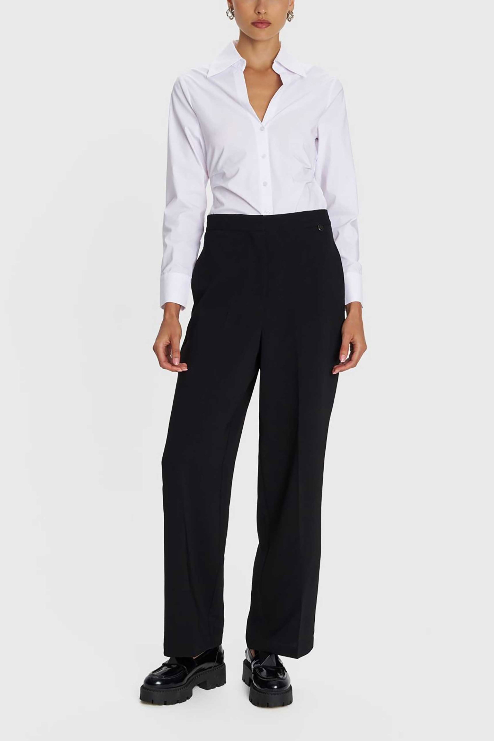 Γυναικείο παντελόνι. Μονόχρωμο. Κλείσιμο με κουμπί και κόπιτσα. Τσέπες στο πλάι. Straight fit. Προέλευση: Κίνα. 96% polyester, 4% elastane Το μοντέλο έχει ύψος 180 cm και φοράει μέγεθος S. AXF Α.Ε. ΕΝΔΥΜΑΤΩΝ ΥΦΑΣΜΑΤΩΝ