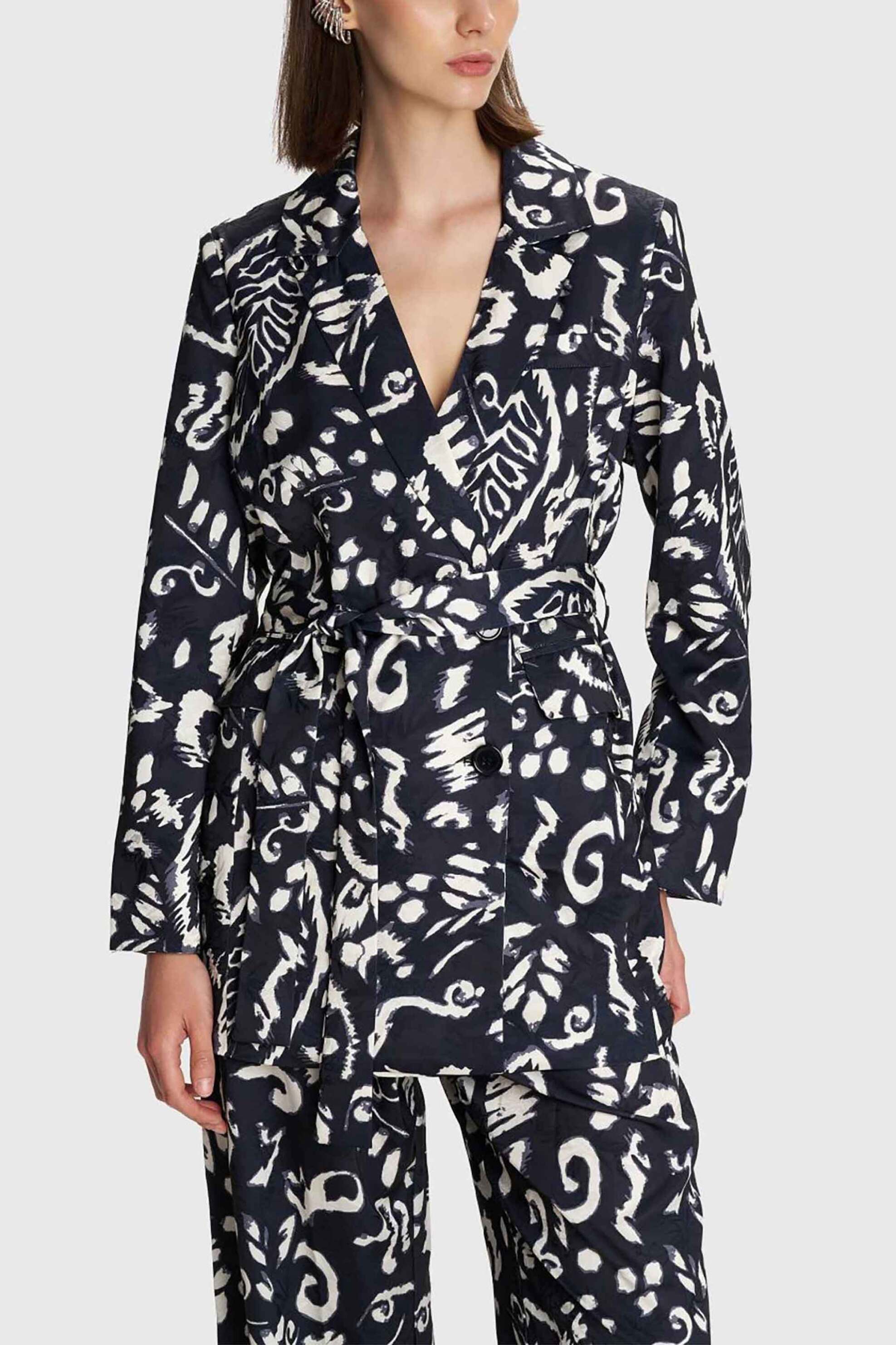 Γυναικείο σακάκι. Abstract print. Κλασικός γιακάς. Zώνη στη μέση. Τσέπες στο πλάι. Κλείσιμο με κουμπιά. Μακρύ μανίκι. Προέλευση: Kίνα. 97% polyester, 3% elastane Το μοντέλο έχει ύψος 179 cm και φοράει μέγεθος S. AXF Α.Ε. ΕΝΔΥΜΑΤΩΝ ΥΦΑΣΜΑΤΩΝ