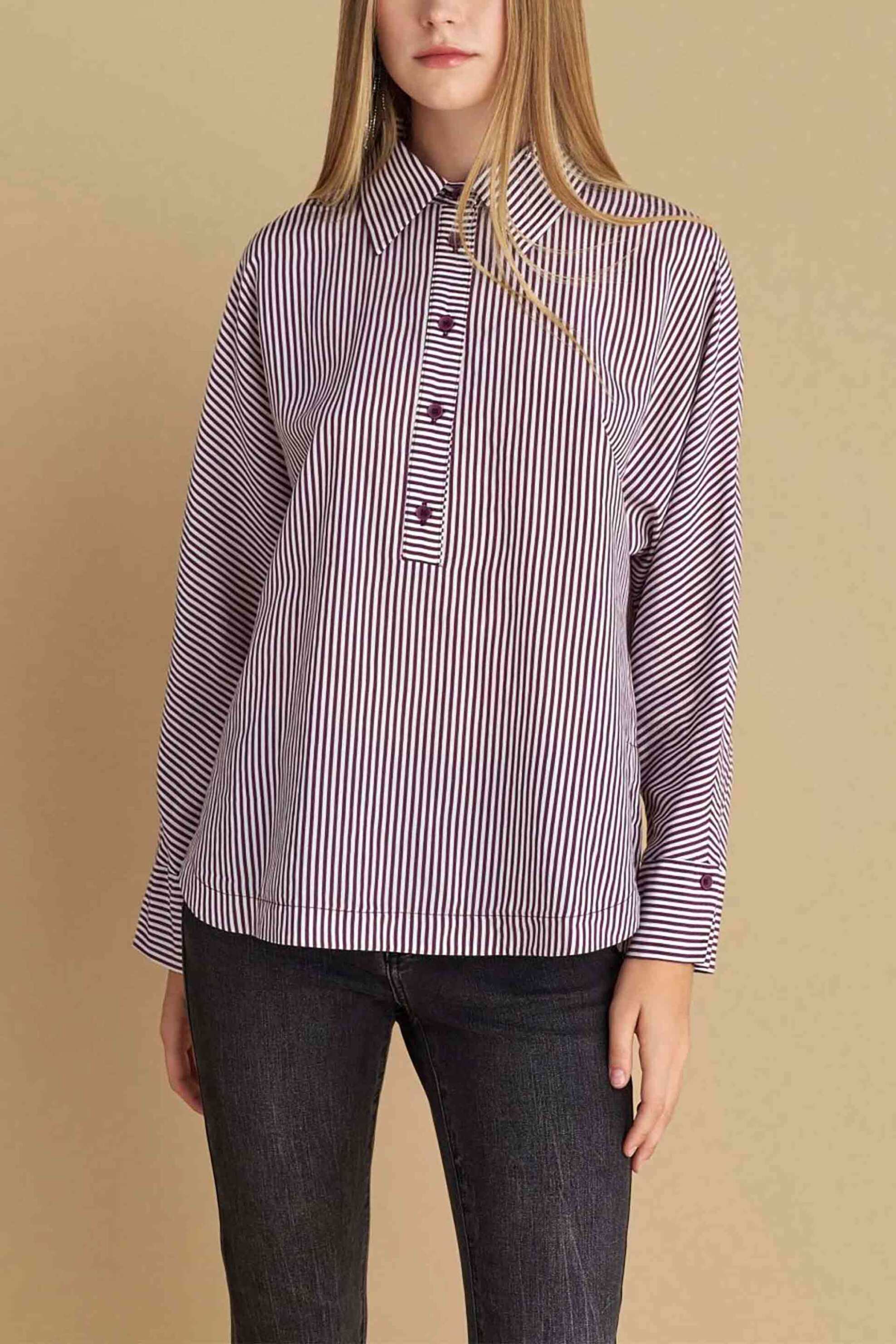 Γυναικεία μπλούζα. Pιγέ σχέδιο. Κλασικός γιακάς. Πατιλέτα με κουμπιά. Μακρύ μανίκι. Προέλευση: Ελλάδα. 81% βισκόζη, 19% polyamide AXF Α.Ε. ΕΝΔΥΜΑΤΩΝ ΥΦΑΣΜΑΤΩΝ