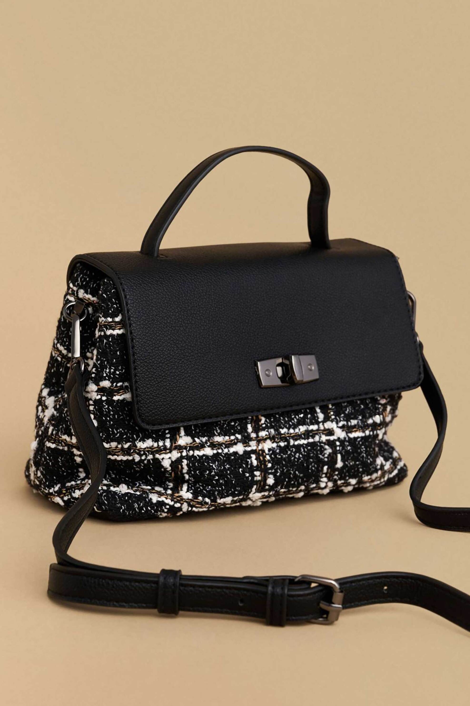 Γυναικεία τσάντα χειρός. Καρό σχέδιο. Flap κλείσιμο. Μεταλλικό κούμπωμα. Προέλευση: Κίνα. 100% polyester AXF Α.Ε. ΕΝΔΥΜΑΤΩΝ ΥΦΑΣΜΑΤΩΝ