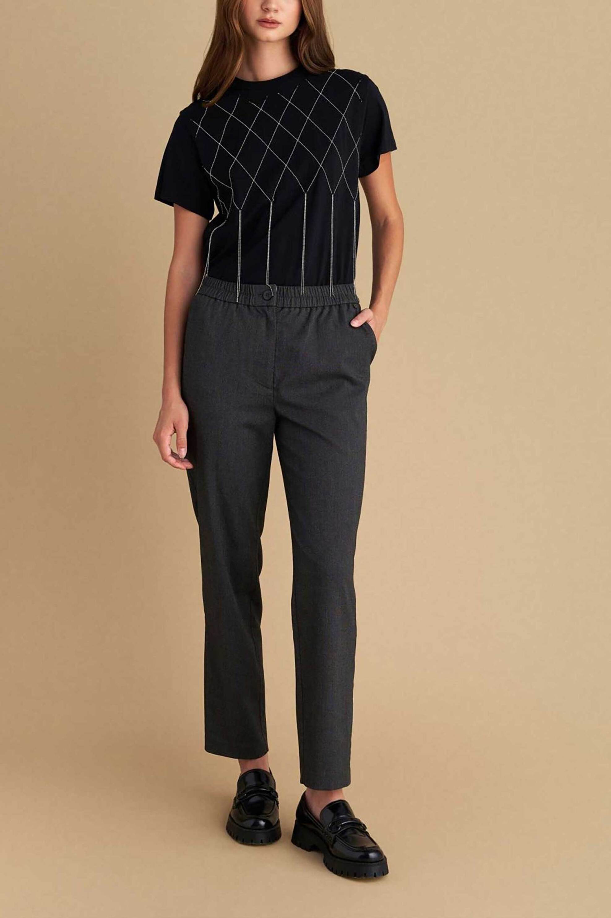 Γυναικείο παντελόνι. Μονόχρωμο. Eλαστική μέση. Τσέπες στο πλάι. Κλείσμο με κουμπί και φερμουάρ. Straight Fit. 63% polyester, 34% βισκόζη, 3% elastane AXF Α.Ε. ΕΝΔΥΜΑΤΩΝ ΥΦΑΣΜΑΤΩΝ