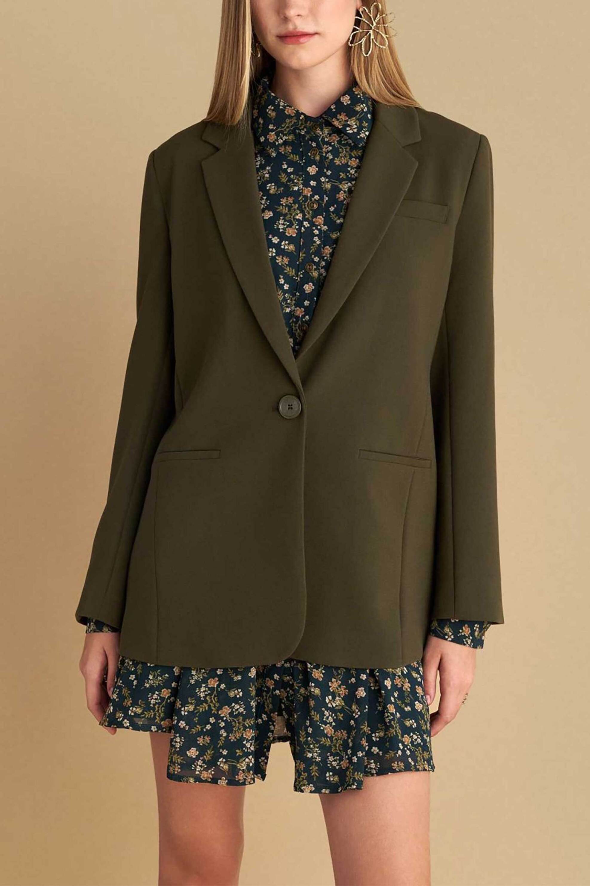Γυναικείο σακάκι. Μονόχρωμο. Κλασικός γιακάς. Διακοσμητικές τσέπες στο πλάι. Κλείσιμο με κουμπί. Straight fit. Προέλευση: Κίνα. 62% polyester, 33% βισκόζη, 5% elastane AXF Α.Ε. ΕΝΔΥΜΑΤΩΝ ΥΦΑΣΜΑΤΩΝ