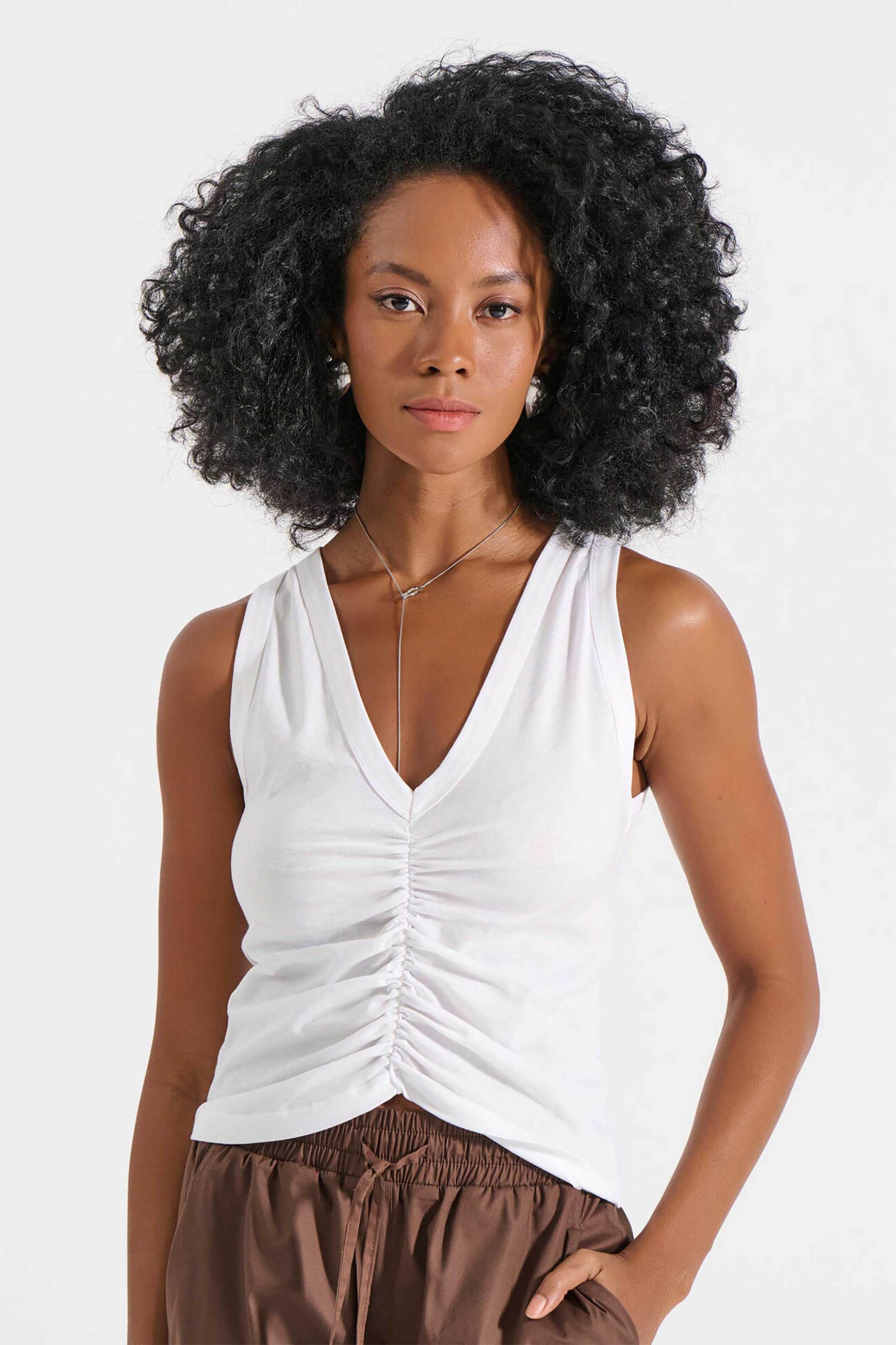 Γυναικεία μπλούζα. Αμάνικη. Μονόχρωμη. Σούρες μπροστά. V λαιμόκοψη. Προέλευση: Ελλάδα. 100% οργανικό βαμβάκι Sustainable: προϊόν που έχει κατασκευαστεί με ίνες ή/και διαδικασίες βιώσιμης παραγωγής, μειώνοντας το περιβαλλοντικό αποτύπωμα. ΚΩΣΤΑΡΙΔΗΣ Β. ΑΒΕΕ BILLCOST