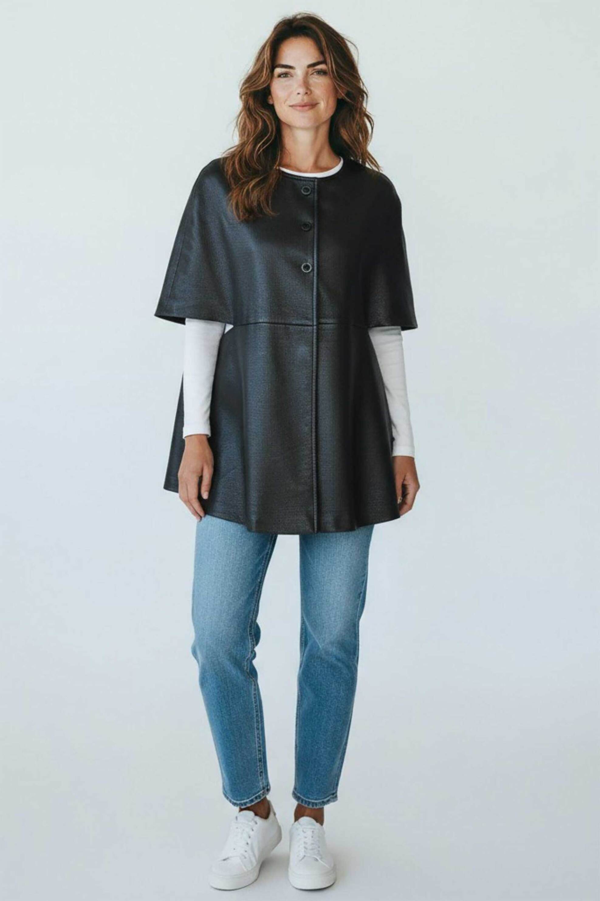 Γυναικεία κάπα. Leather look. Κλείσιμο με κουμπιά. Κοντό μανίκι. Relaxed fit. Προέλευση: Ελλάδα. 54% polyester, 40% rayon, 6% spandex ΚΩΣΤΑΡΙΔΗΣ Β. ΑΒΕΕ BILLCOST