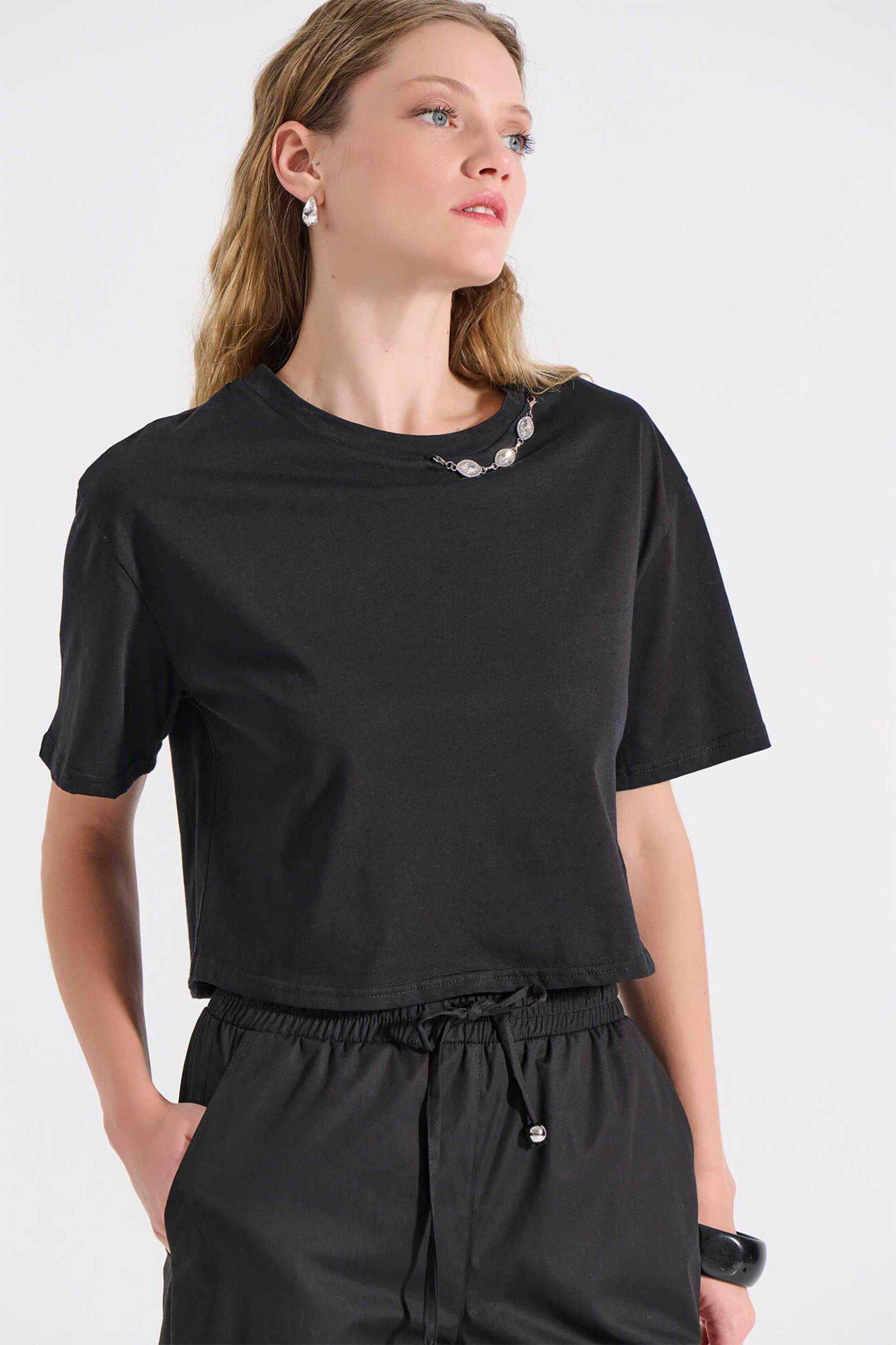 Γυναικεία μπλούζα. Cropped. Μονόχρωμη. Στρογγυλή λαιμόκοψη. Διακοσμητική αλυσίδα στο λαιμό. Κοντό μανίκι. Προέλευση: Ελλάδα. 100% οργανικό βαμβάκι Sustainable: προϊόν που έχει κατασκευαστεί με ίνες ή/και διαδικασίες βιώσιμης παραγωγής, μειώνοντας το περιβαλλοντικό αποτύπωμα. ΚΩΣΤΑΡΙΔΗΣ Β. ΑΒΕΕ BILL...