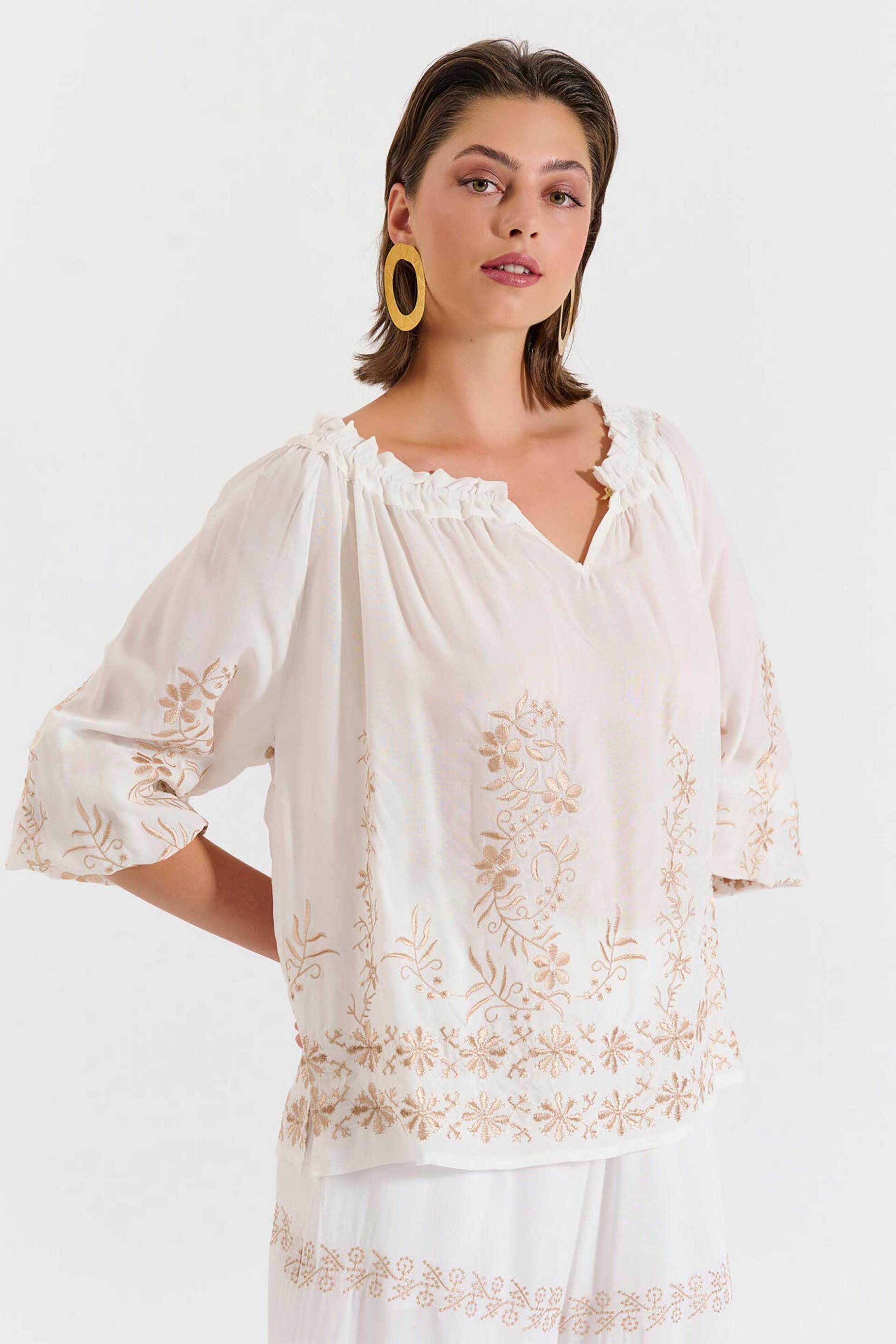 Γυναικεία μπλούζα. Σούρες στη λαιμόκοψη. Σχέδιο με κεντήματα. Μανίκι 3/4. Προέλευση: Ελλάδα. 100% rayon ΚΩΣΤΑΡΙΔΗΣ Β. ΑΒΕΕ BILLCOST