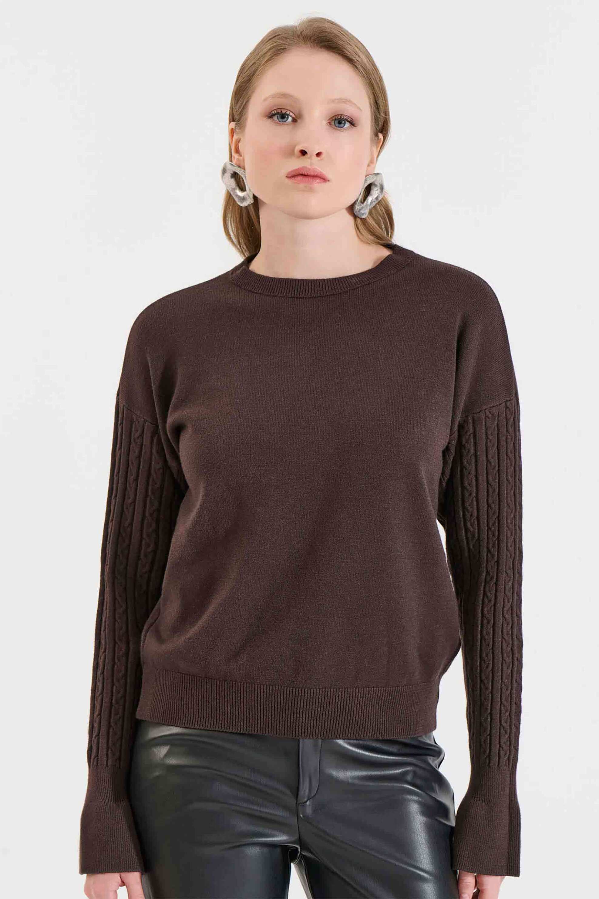 Γυναικεία πλεκτή μπλούζα. Μονόχρωμη. Cable knit pattern στα μανίκια. Ribbed τελειώματα. Προέλευση: Ελλάδα. 56% βισκόζη, 26% polyester, 22% nylon ΚΩΣΤΑΡΙΔΗΣ Β. ΑΒΕΕ BILLCOST
