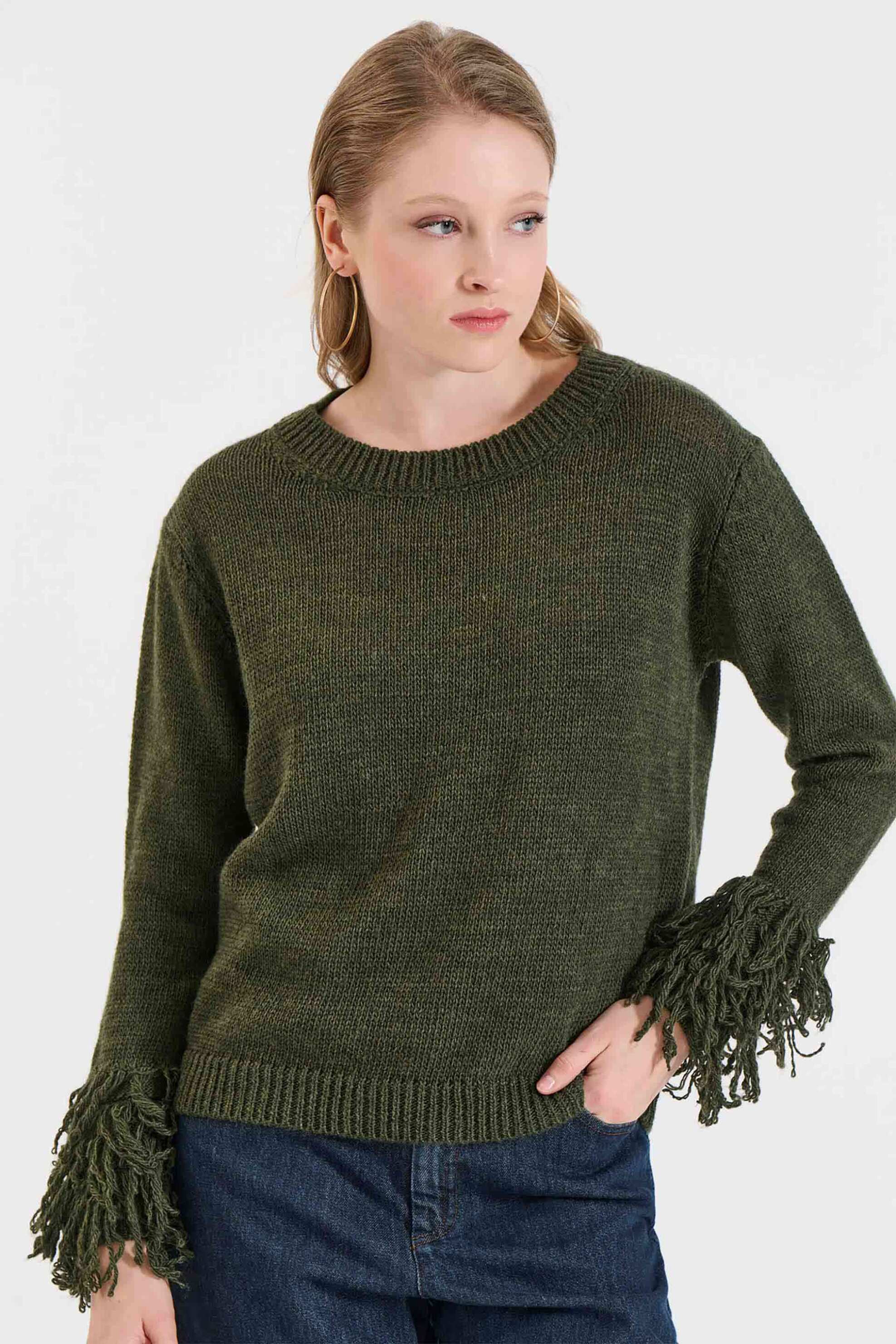Γυναικεία πλεκτή μπλούζα. Μονόχρωμη. Κρόσσια στα μανίκια. Στρογγυλή λαιμόκοψη. Ribbed τελειώματα. Προέλευση: Ελλάδα. 75% polyacrylic, 10% μαλλί, 10% βισκόζη, 5% alpaka ΚΩΣΤΑΡΙΔΗΣ Β. ΑΒΕΕ BILLCOST