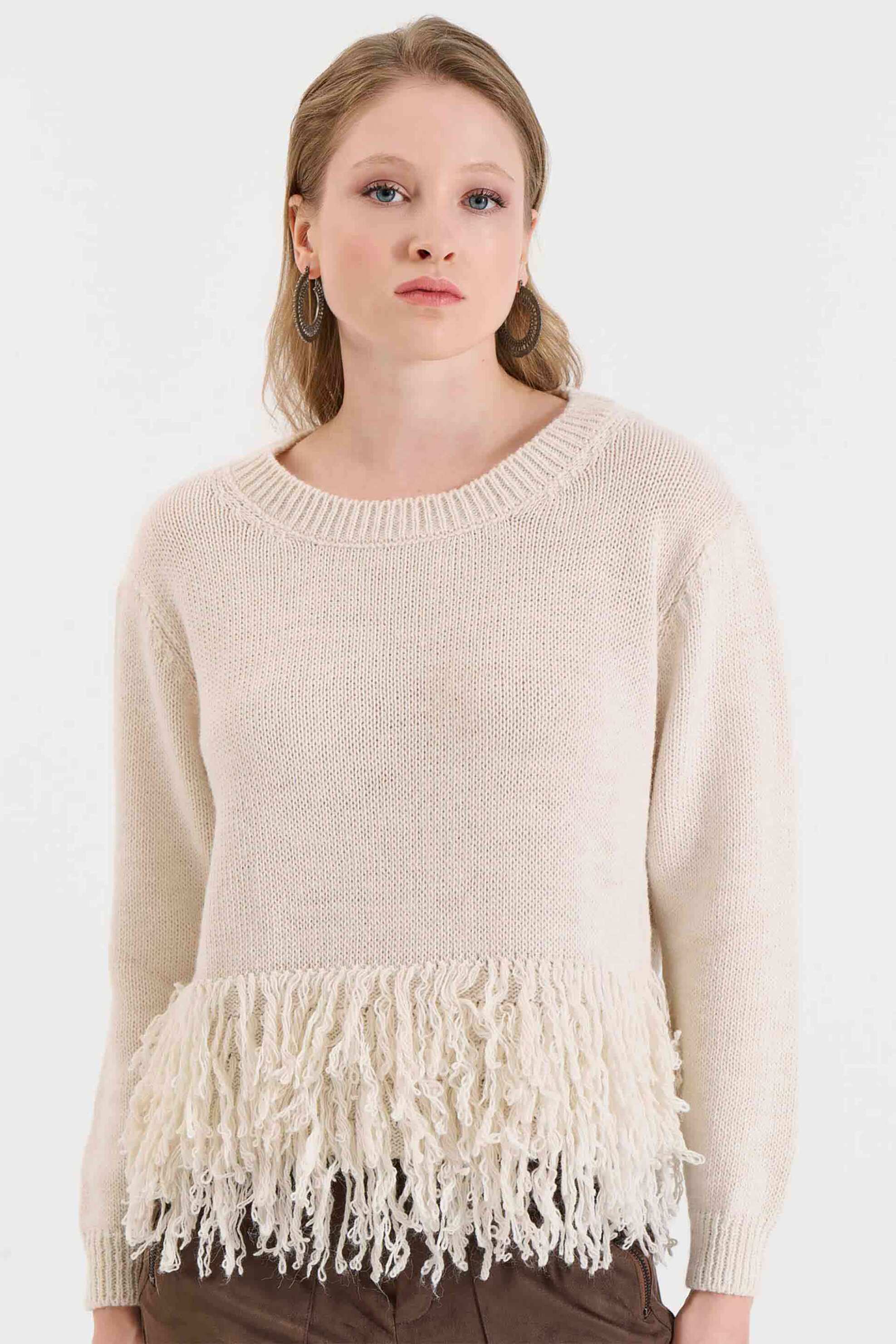Γυναικεία πλεκτή μπλούζα. Μονόχρωμη. Κρόσσια στο κάτω μέρος. Στρογγυλή λαιμόκοψη. Ribbed τελειώματα. Προέλευση: Ελλάδα. 75% polyacrylic, 10% μαλλί, 10% βισκόζη, 5% alpaka ΚΩΣΤΑΡΙΔΗΣ Β. ΑΒΕΕ BILLCOST