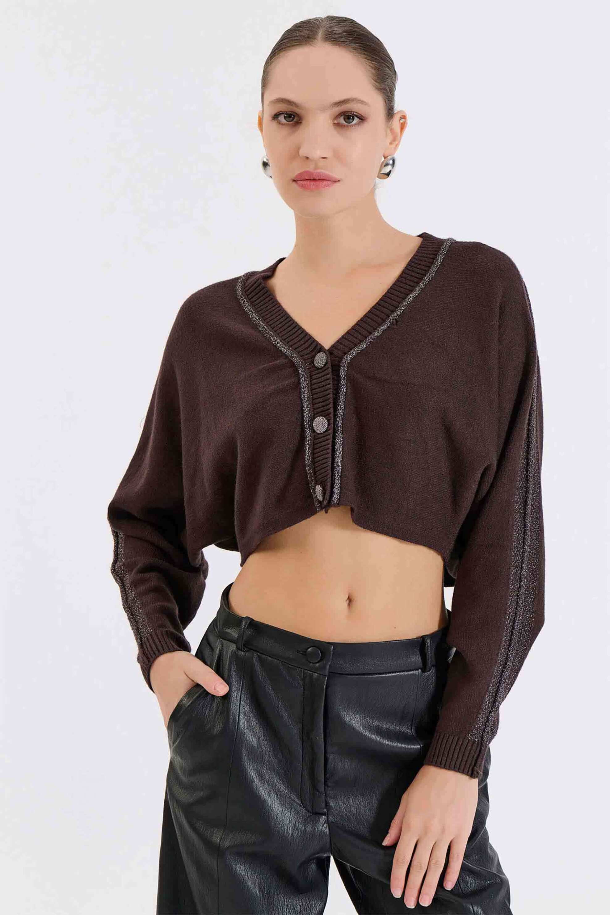 Γυναικεία πλεκτή ζακέτα. Μονόχρωμη lurex. Cropped. Κλείσιμο με κουμπιά. V λαιμόκοψη. Προέλευση: Ελλάδα. 56% βισκόζη, 28% polyester, 16% nylon ΚΩΣΤΑΡΙΔΗΣ Β. ΑΒΕΕ BILLCOST