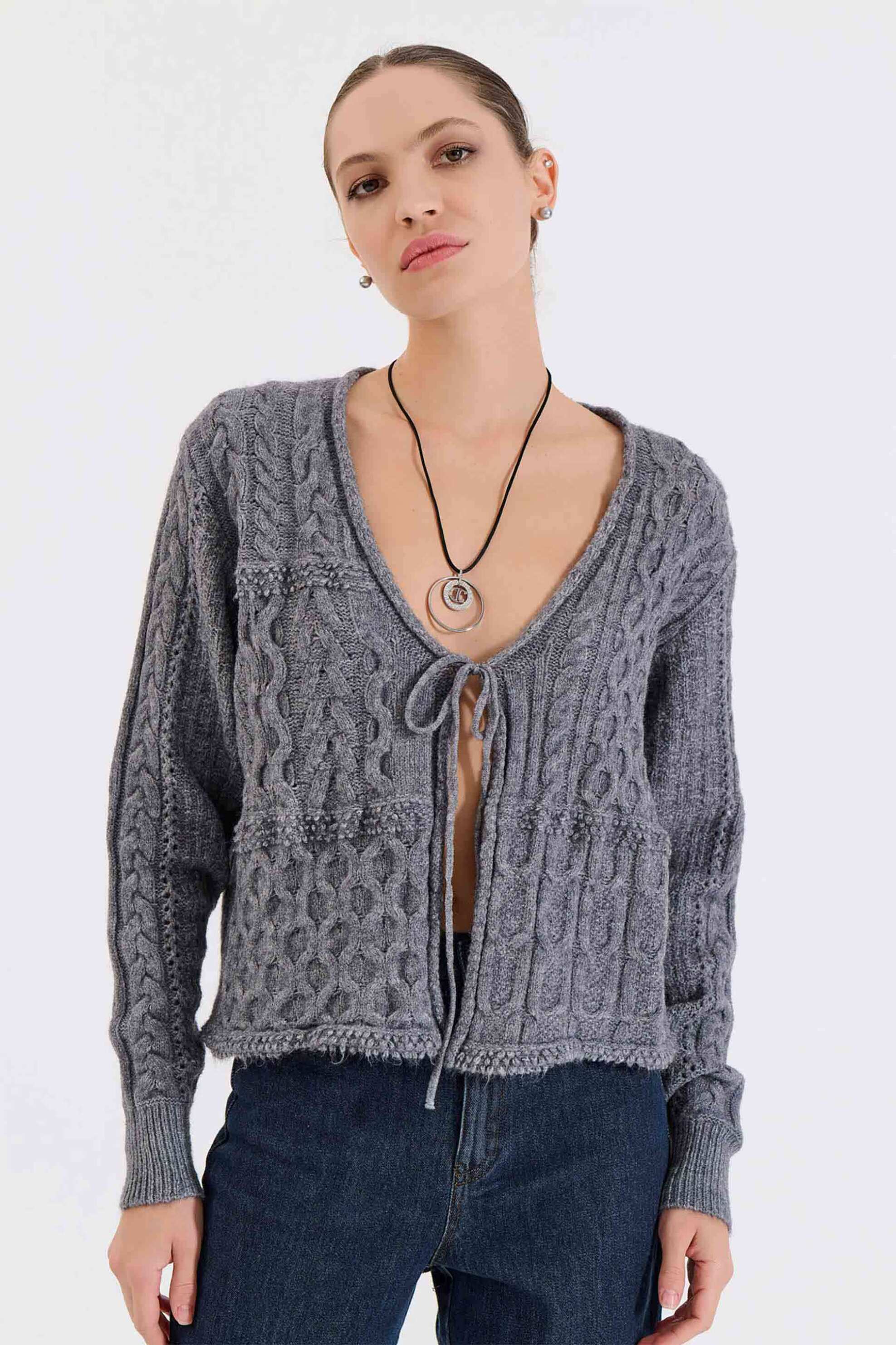 Γυναικεία πλεκτή ζακέτα. Ανάγλυφη πλέξη. Μονόχρωμη. Δέσιμο μπροστά. V λαιμόκοψη. Ribbed μανσέτες. Προέλευση: Ελλάδα. 43% polyacrylic, 30% polyester, 27% nylon ΚΩΣΤΑΡΙΔΗΣ Β. ΑΒΕΕ BILLCOST