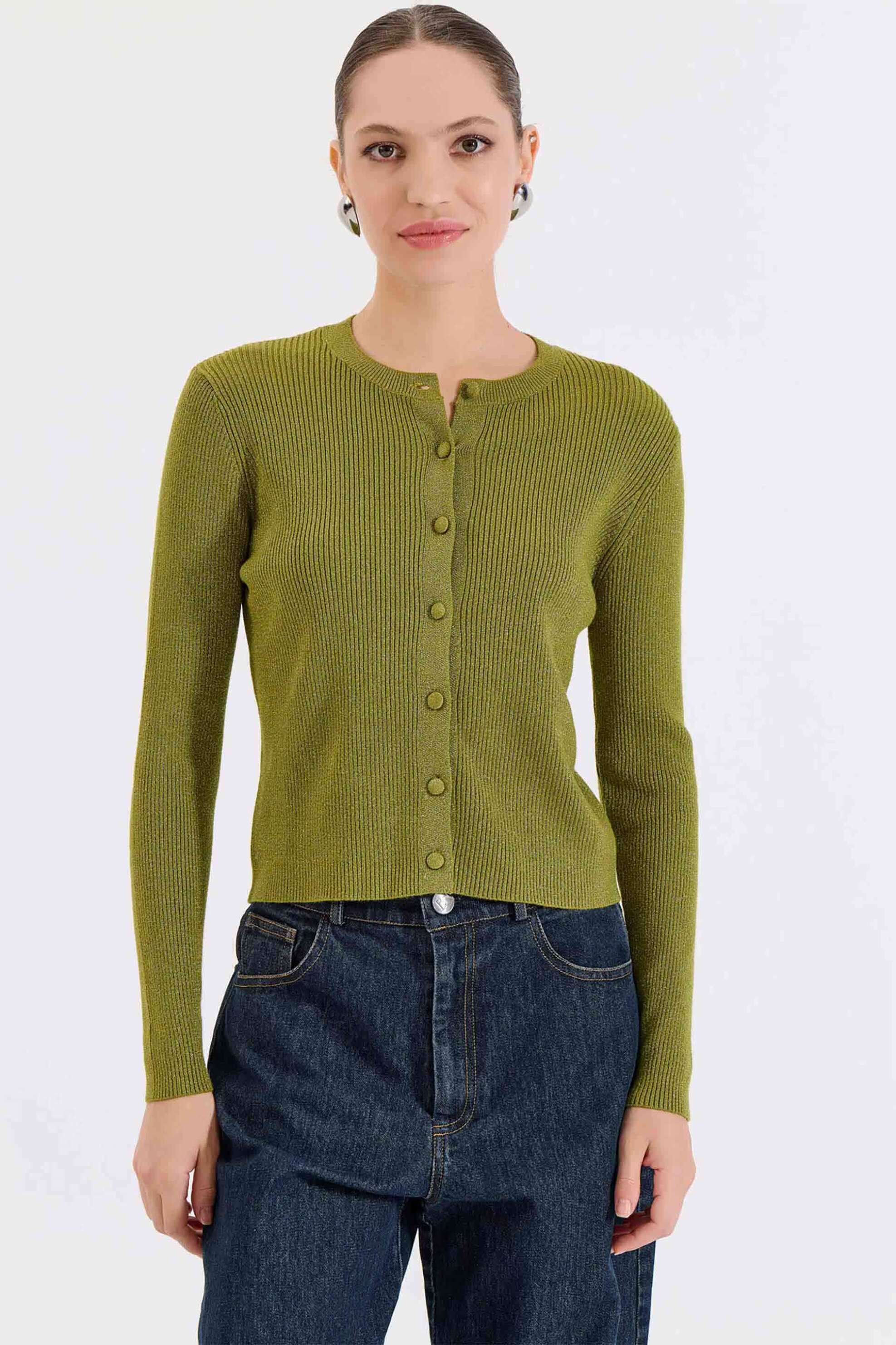 Γυναικεία πλεκτή ζακέτα. Μονόχρωμη lurex. Ribbed ύφανση. Κλείσιμο με κουμπιά. Στρογγυλή λαιμόκοψη. Slim fit. Προέλευση: Ελλάδα. 56% βισκόζη, 28% polyester, 16% nylon ΚΩΣΤΑΡΙΔΗΣ Β. ΑΒΕΕ BILLCOST