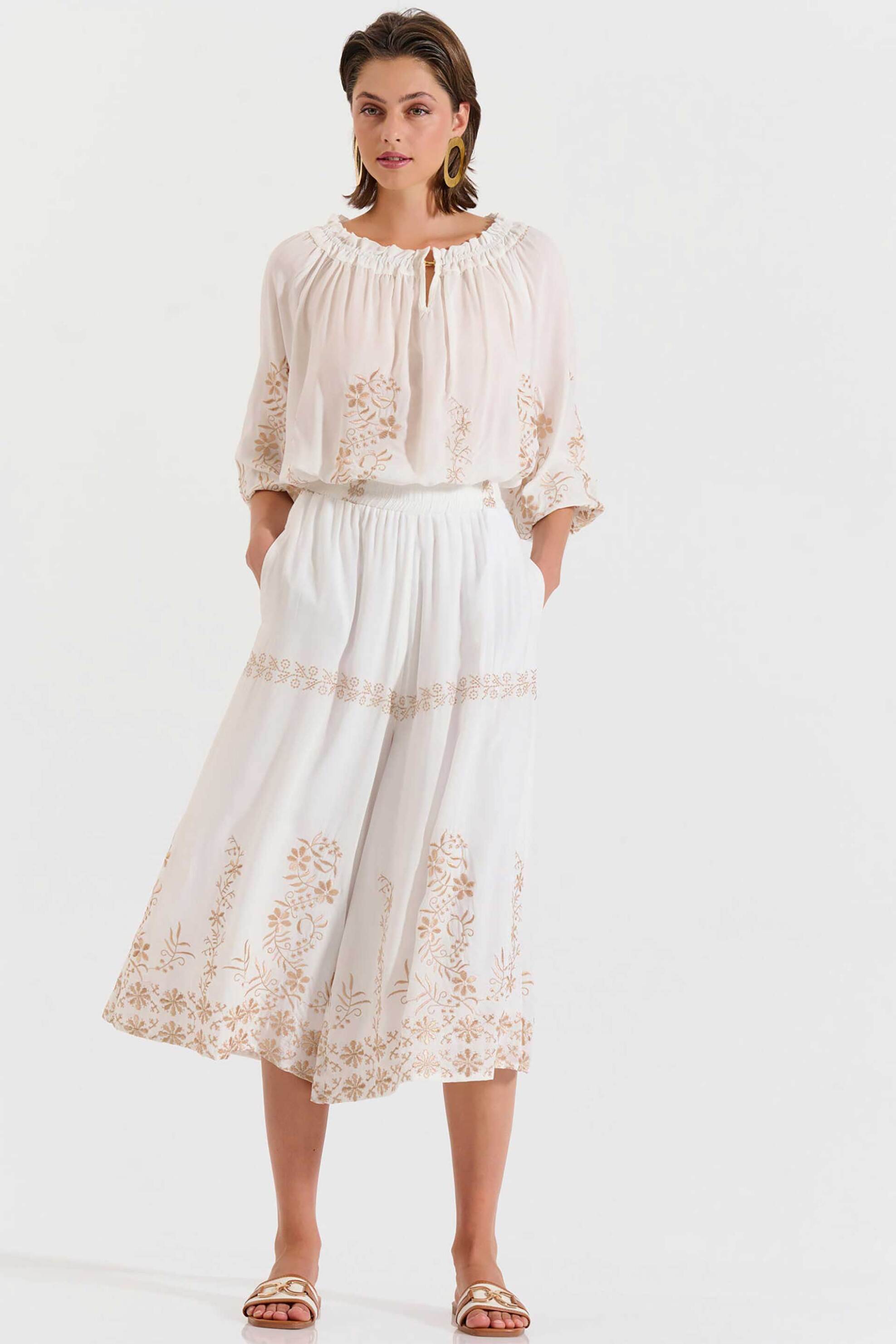 Γυναικεία ζιπ κιλότ. Σχέδιο με κεντήματα. Ελαστική μέση. Τσέπες στο πλάι. Χαλαρή γραμμή. Προέλευση: Ελλάδα. 100% rayon ΚΩΣΤΑΡΙΔΗΣ Β. ΑΒΕΕ BILLCOST