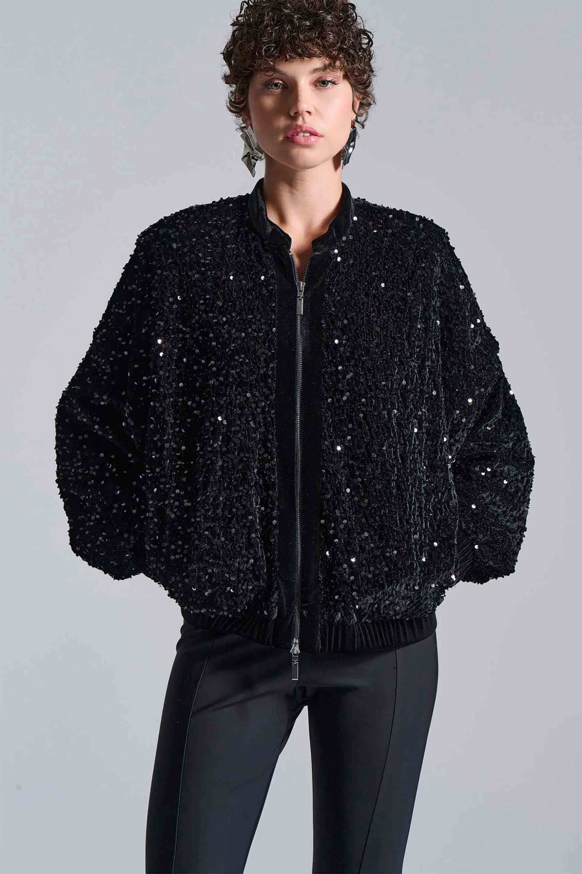 Γυναικείο bomber jacket. Παγιέτες. Κλείσιμο με φερμουάρ. Τσέπες στο πλάι. Ελαστικές μανσέτες και κάτω μέρος. Relaxed fit. Προέλευση: Ελλάδα. 100% polyester ΚΩΣΤΑΡΙΔΗΣ Β. ΑΒΕΕ BILLCOST