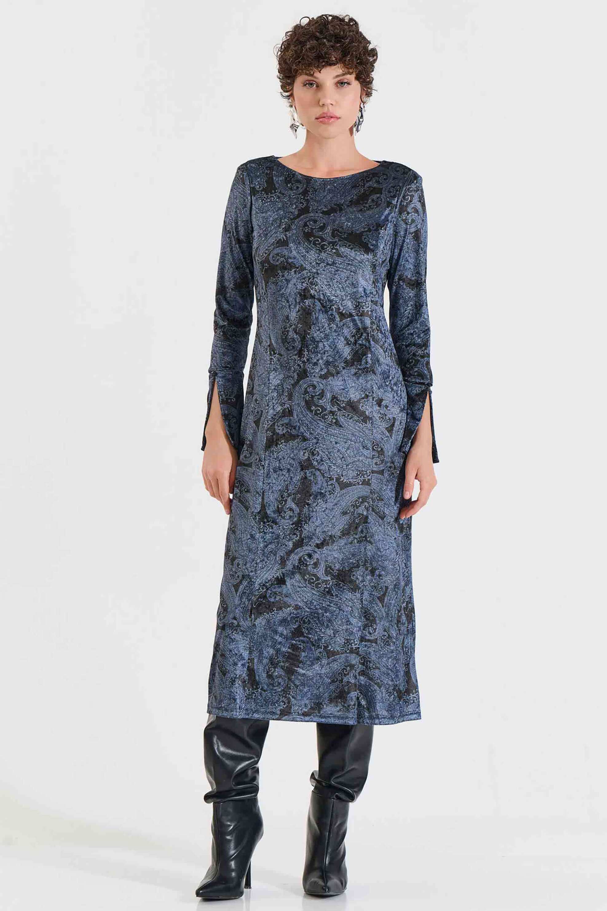 Γυναικείο midi φόρεμα. Paisley pattern. Κλείσιμο με κουμπιά στο πίσω μέρος. Άνοιγμα στα μανίκια. Μακρύ μανίκι. Προέλευση: Ελλάδα. 92% polyester, 8% spandex ΚΩΣΤΑΡΙΔΗΣ Β. ΑΒΕΕ BILLCOST