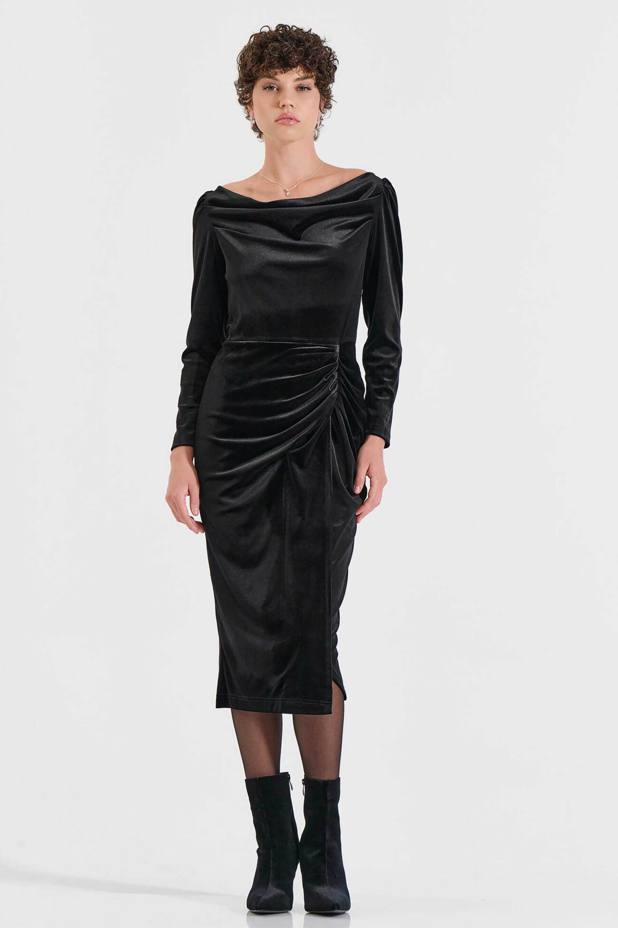 Γυναικείο midi φόρεμα. Βελούδινη υφή. Κλείσιμο με φερμουάρ στο πίσω μέρος. Draped λαιμόκοψη. Σούρες. Μακρύ μανίκι. Άνοιγμα στο πλάι. Προέλευση: Ελλάδα. 94% polyester, 6% spandex ΚΩΣΤΑΡΙΔΗΣ Β. ΑΒΕΕ BILLCOST