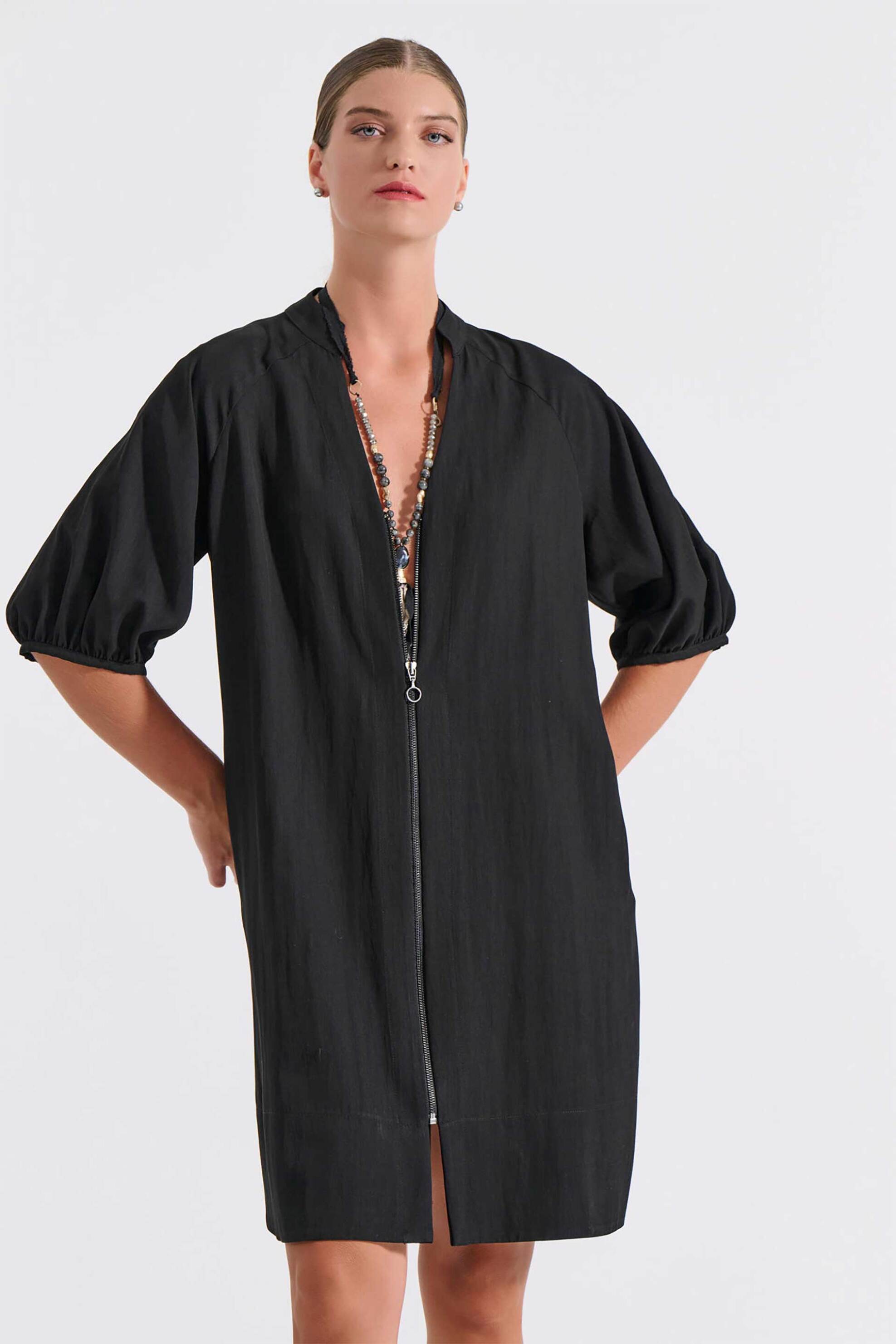 Γυναικείο mini φόρεμα. Μονόχρωμο. Κλείσιμο με φερμουάρ μπροστά. Μανίκι 3/4. Ίσια γραμμή. Προέλευση: Ελλάδα. 72% rayon, 28% nylon ΚΩΣΤΑΡΙΔΗΣ Β. ΑΒΕΕ BILLCOST