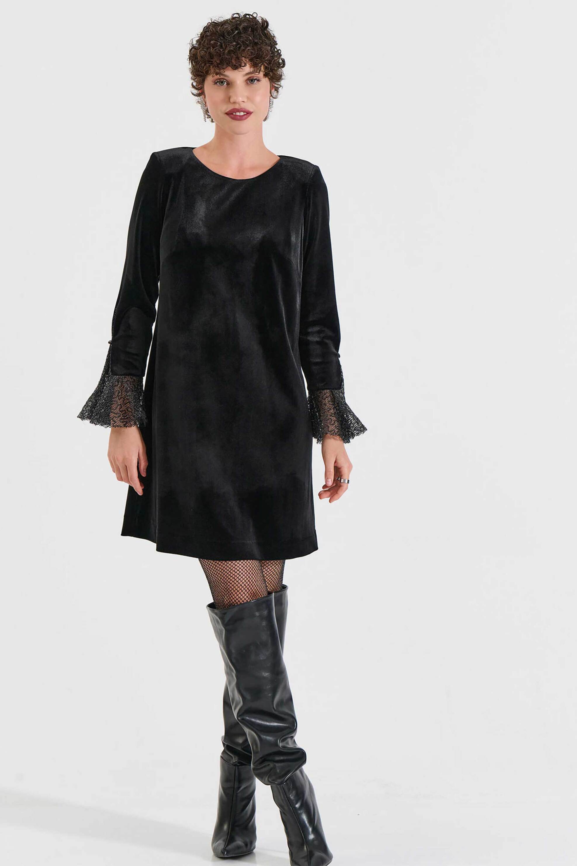 Γυναικείο mini φόρεμα. Βελούδινη υφή. Κλείσιμο με φερμουάρ στο πίσω μέρος. Στρογγυλή λαιμόκοψη. Μανσέτες από τούλι. Μακρύ μανίκι. Προέλευση: Ελλάδα. 94% polyester, 6% spandex ΚΩΣΤΑΡΙΔΗΣ Β. ΑΒΕΕ BILLCOST