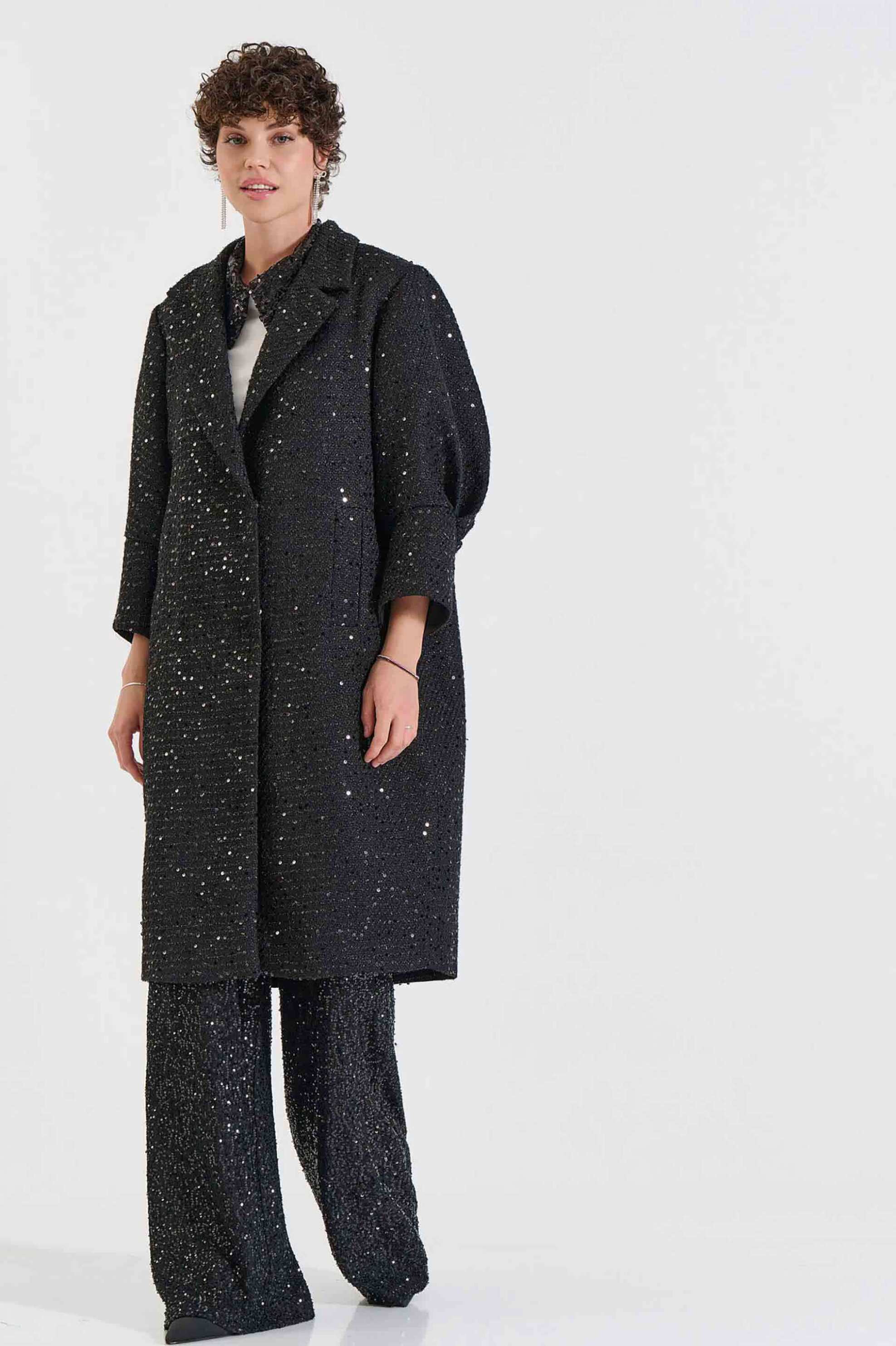Γυναικείο παλτό. Σχέδιο με παγιέτες. Κλείσιμο με κουμπιά. Τσέπες στο πλάι. Προέλευση: Ελλάδα. 100% polyester ΚΩΣΤΑΡΙΔΗΣ Β. ΑΒΕΕ BILLCOST