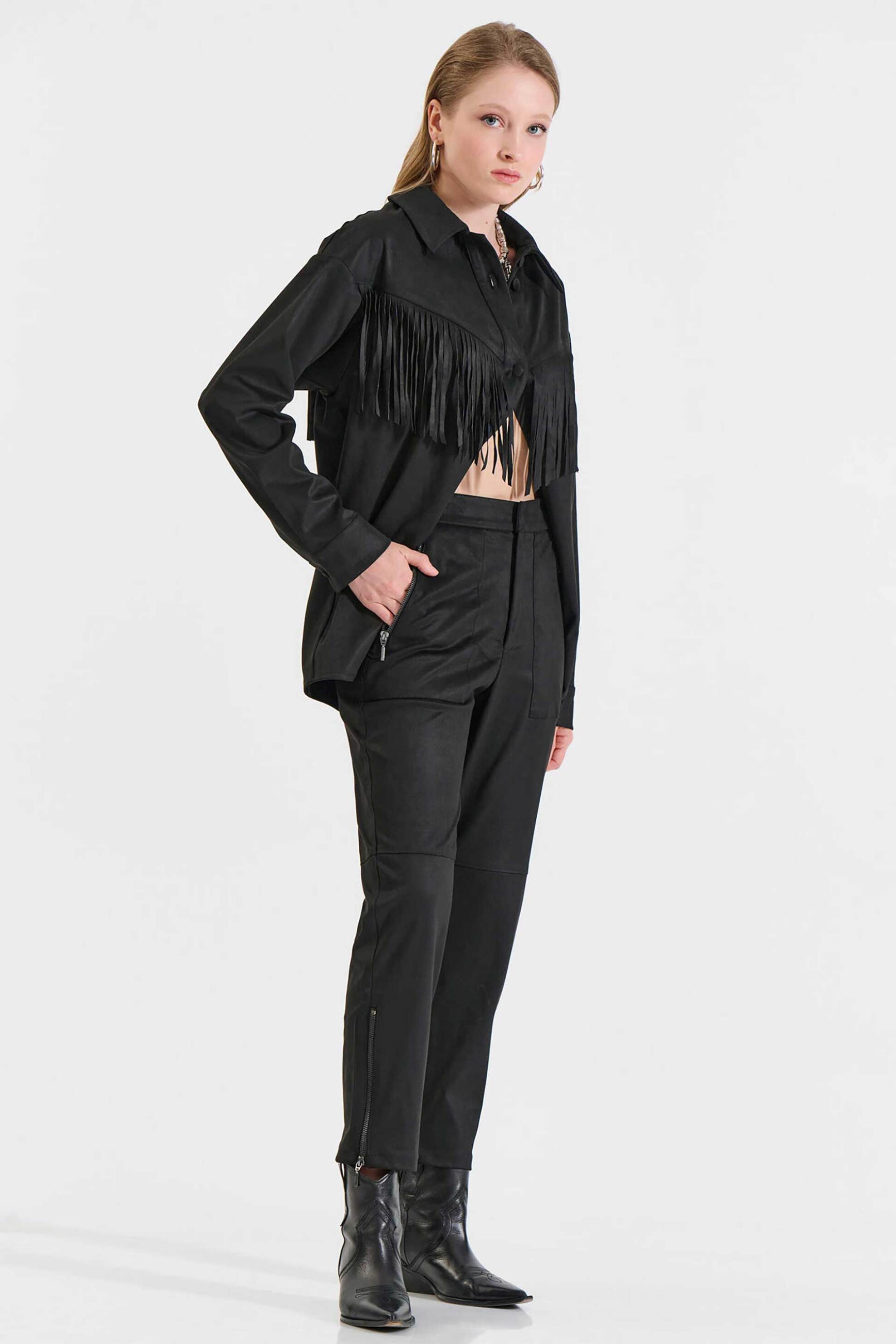 Γυναικείο παντελόνι. Μονόχρωμο. Suede υφή. Ελαστική μέση. Τσέπες με φερμουάρ στο πλάι. Τσέπες στο πίσω μέρος. Ανοίγματα με φερμουάρ στα τελειώματα. Προέλευση: Ελλάδα. 90% polyester, 10% spandex ΚΩΣΤΑΡΙΔΗΣ Β. ΑΒΕΕ BILLCOST