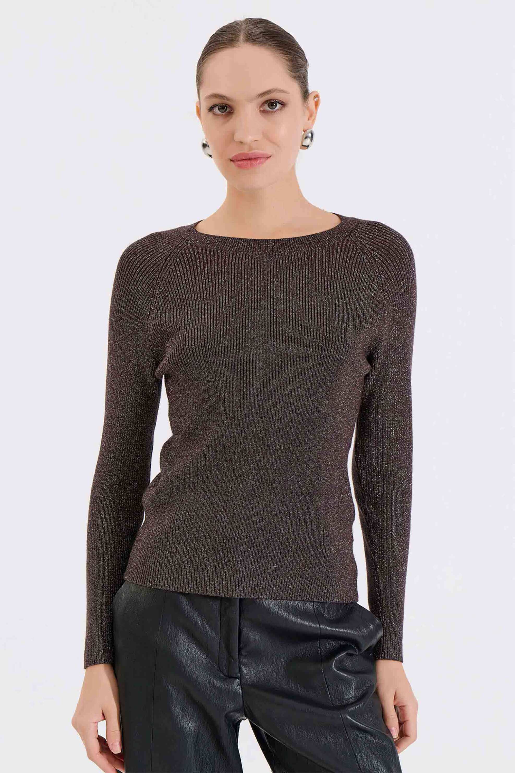 Γυναικείο πουλόβερ. Μονόχρωμο lurex. Ribbed ύφανση. Στρογγυλή λαιμόκοψη. Μακρύ μανίκι. Προέλευση: Ελλάδα. 56% βισκόζη, 28% polyester, 16% nylon ΚΩΣΤΑΡΙΔΗΣ Β. ΑΒΕΕ BILLCOST