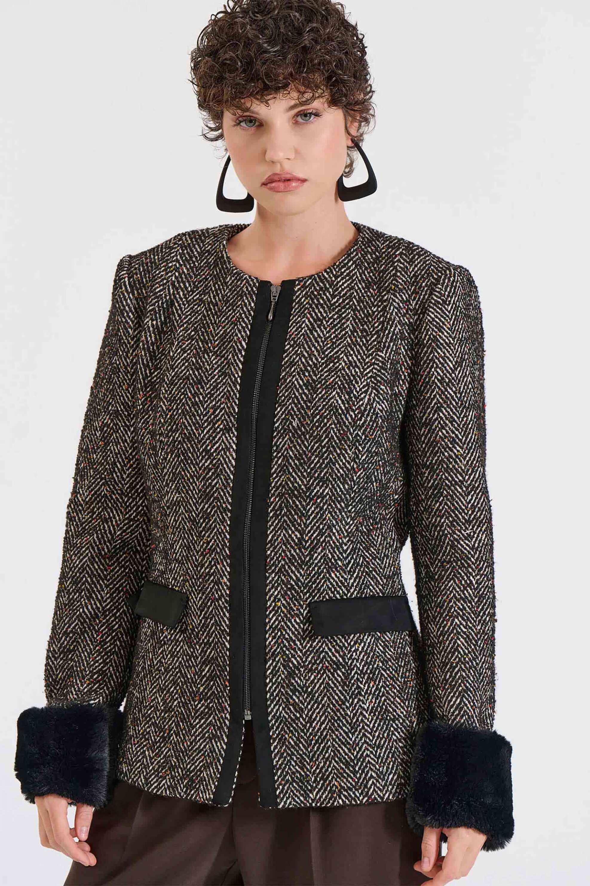 Γυναικείο σακάκι. Σχέδιο ψαροκόκκαλο. Κλείσιμο με φερμουάρ. Αποσπώμενη faux γούνα στα μανίκια. Faux flap τσέπες στο πλάι. Προέλευση: Ελλάδα. 90% polyester, 10% άλλες ίνες ΚΩΣΤΑΡΙΔΗΣ Β. ΑΒΕΕ BILLCOST