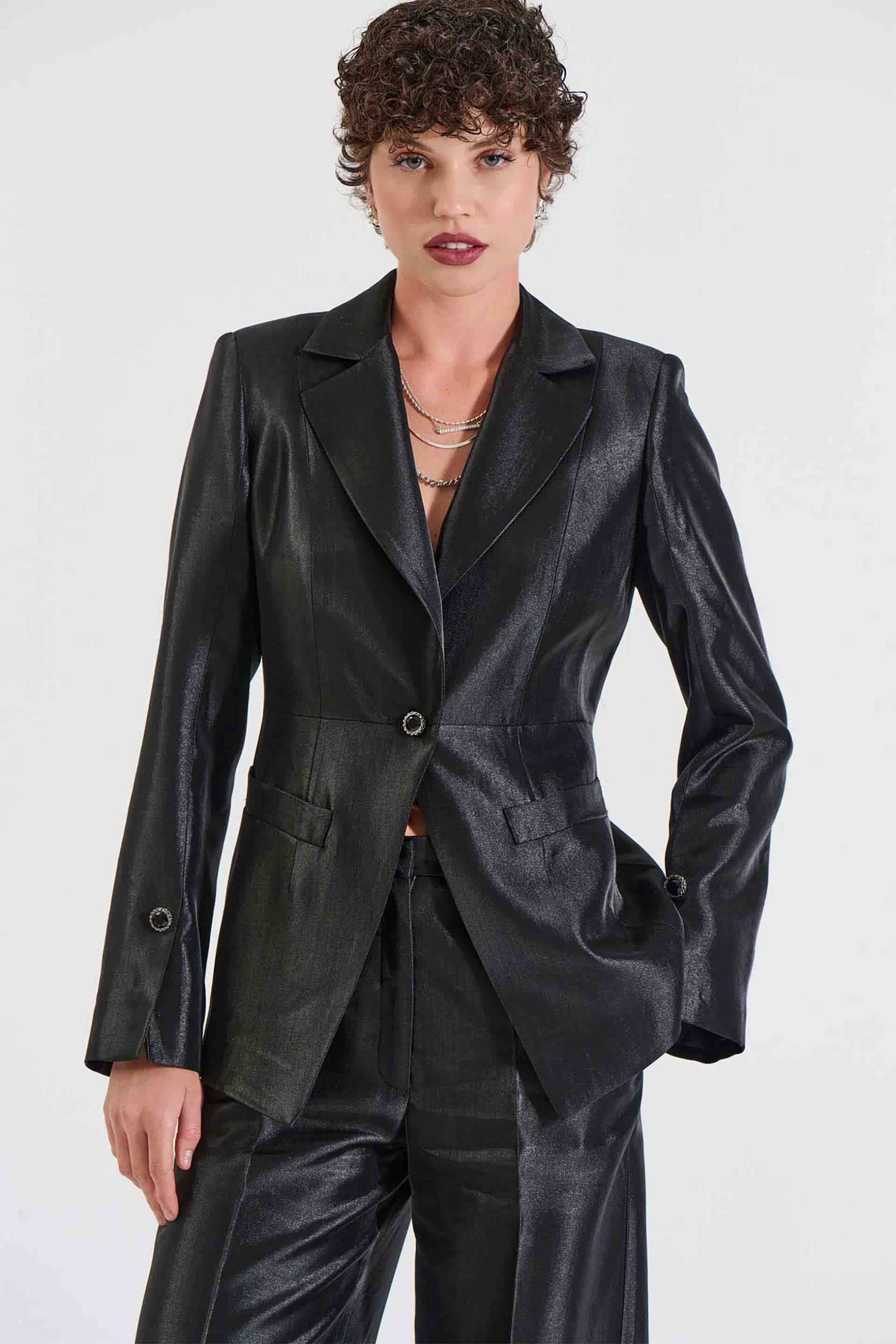 Γυναικείο σακάκι. Σατέν. Κλείσιμο με κουμπί. Τσέπες στο πλάι. Προέλευση: Ελλάδα. 83% rayon, 10% polyester, 7% nylon ΚΩΣΤΑΡΙΔΗΣ Β. ΑΒΕΕ BILLCOST