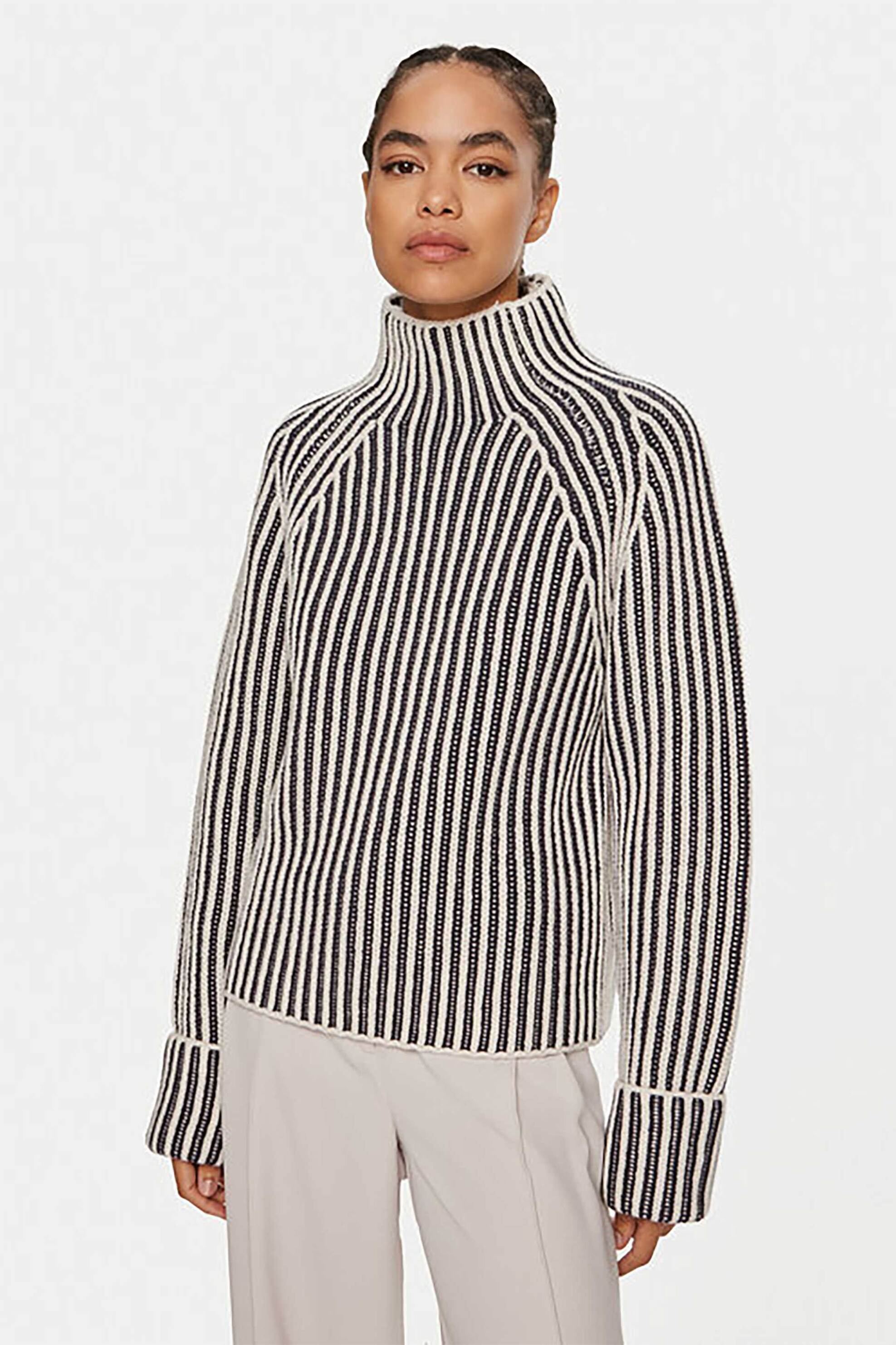 Γυναικείο ζιβάγκο. Ριγέ σχέδιο. Μακρύ μανίκι με ρεβέρ στο τελείωμα. Regular fit. 100% μαλλί