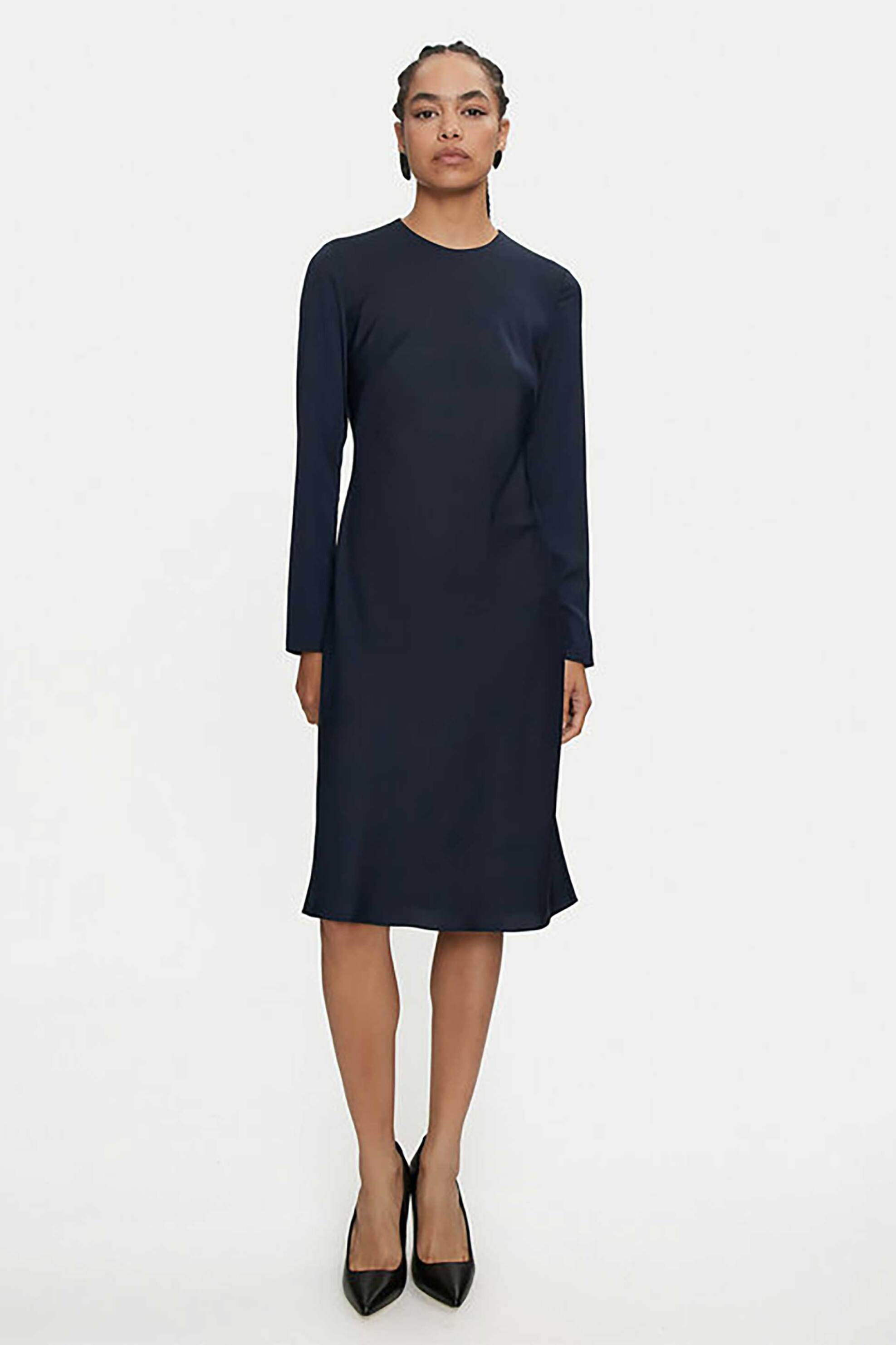 Γυναικείο mini φόρεμα. Μονόχρωμο. Στρογγυλή λαιμόκοψη. Μακρύ μανίκι. Μεταλλικό λογότυπο στο πίσω μέρος. Flare. Regular fit. 100% recycled polyester