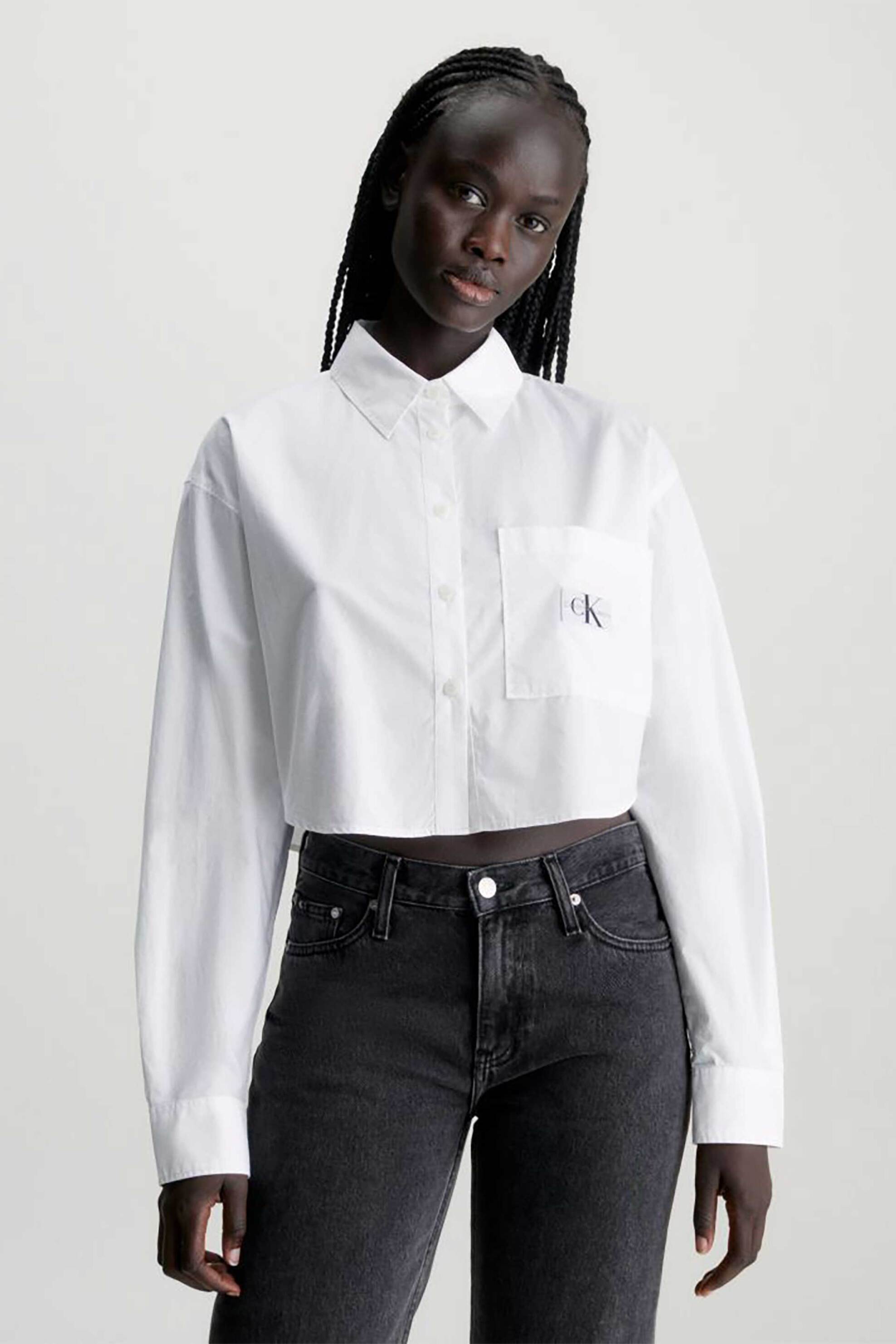 Γυναικείο πουκάμισο. Cropped. Μονόχρωμο. Τσέπη με λογότυπο στο στήθος. Μακρύ μανίκι. Relaxed fit. 100% βαμβάκι