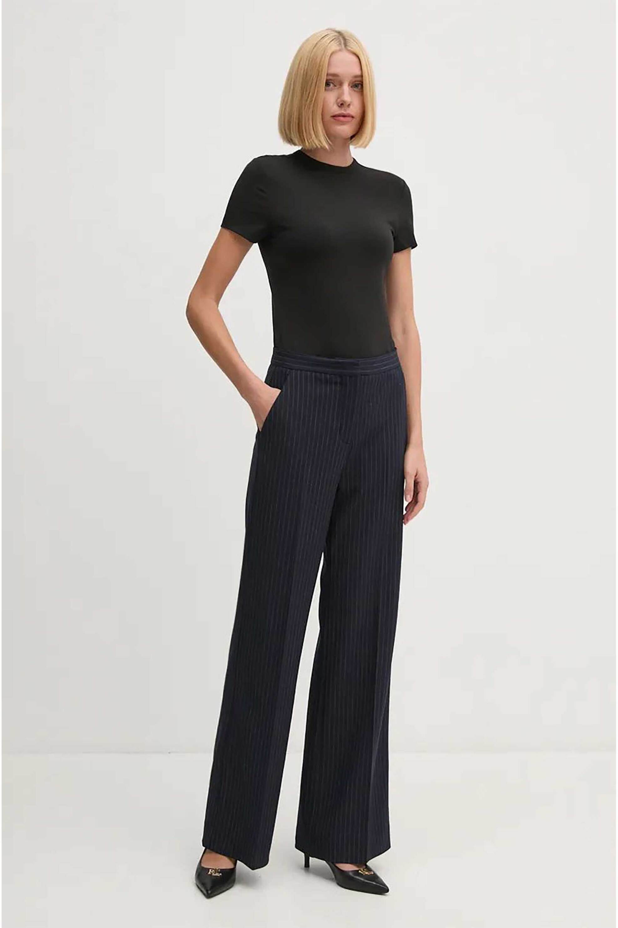 Γυναικείο παντελόνι. Ψηλόμεσο. Ριγέ σχέδιο. Κλείσιμο με γάντζο και φερμουάρ. Τσέπες στο πλάι και στο πίσω μέρος. Wide leg. 62% polyester, 26% βισκόζη, 9% μαλλί, 3% spandex