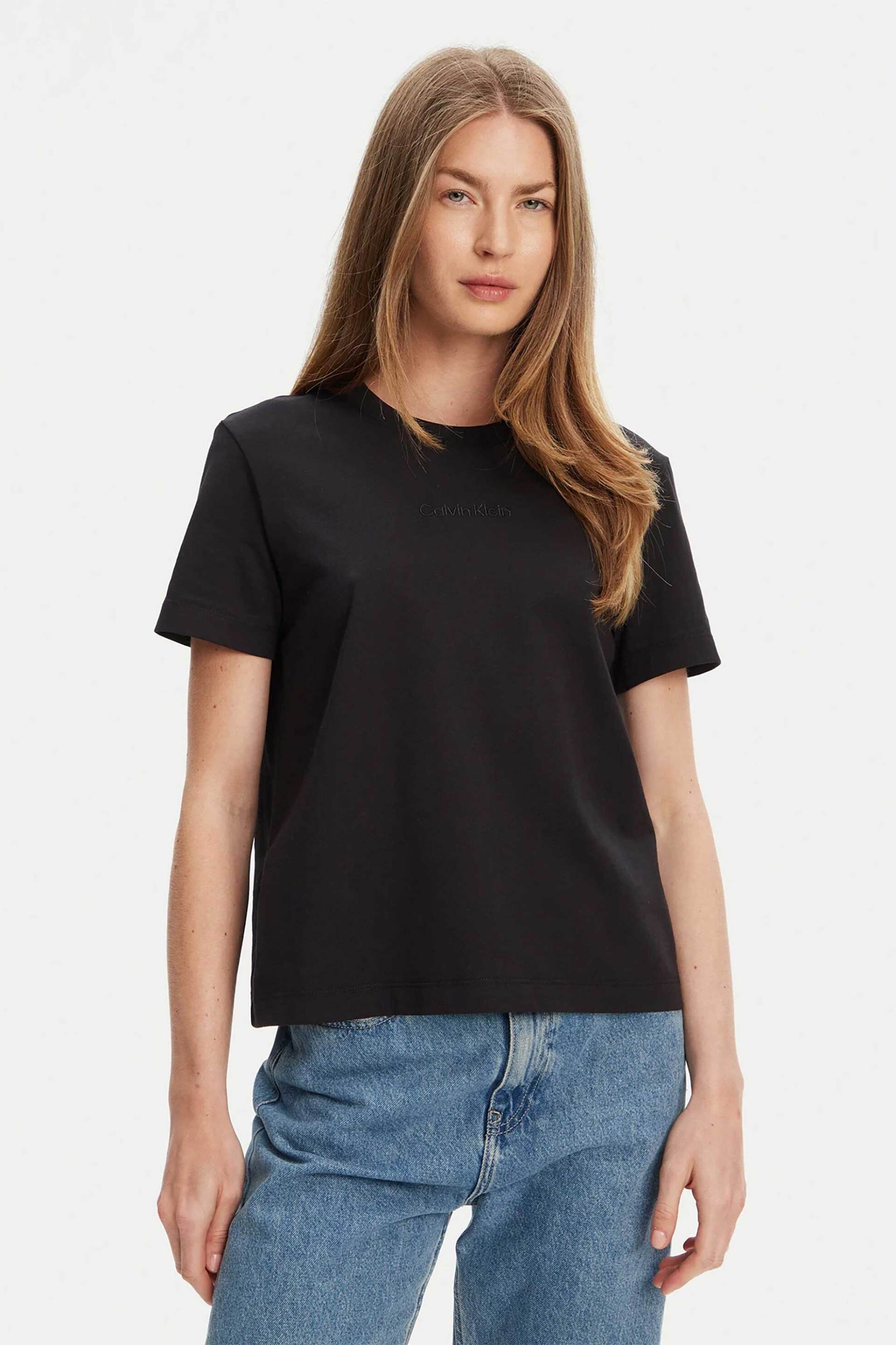 Γυναικείο T-shirt. Μονόχρωμο. Στρογγυλή λαιμόκοψη. Σταμπτωτό λογότυπο στο μπροστινό μέρος. Regular fit. Προέλευση: ΙΝ. 100% βαμβάκι SARKK ABEE