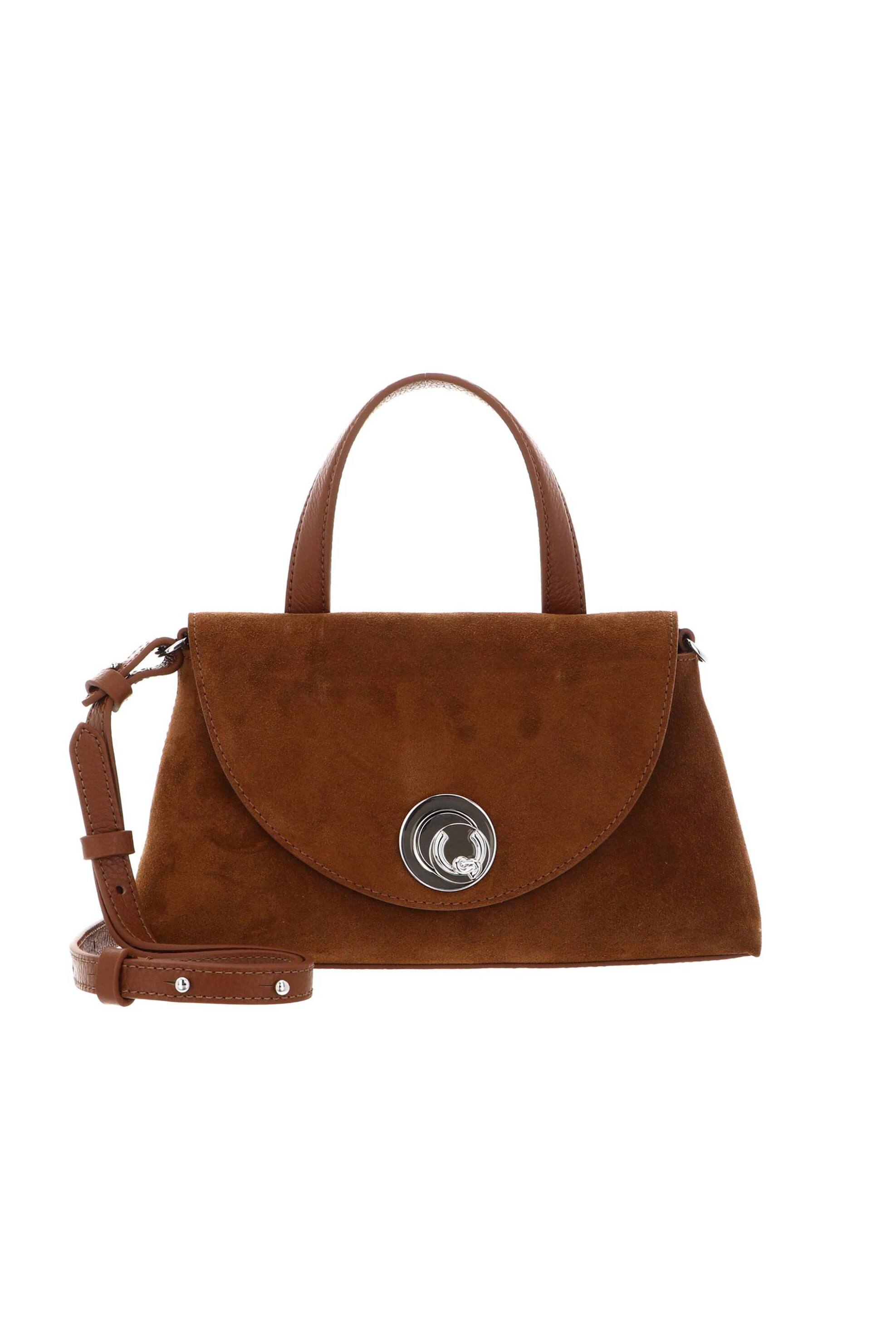 Γυναικεία τσάντα χειρός. Λογότυπο. Flap κλείσιμο. Σταθερή λαβή. Αποσπώμενο και ρυθμιζόμενο λουράκι ώμου. Εσωτερική τσέπη με φερμουάρ. Διαστάσεις: 26 x 15 x 8 cm. Προέλευση: PRC. 100% δέρμα suede ΛΑΝΑΚΑΜ Α.Ε.