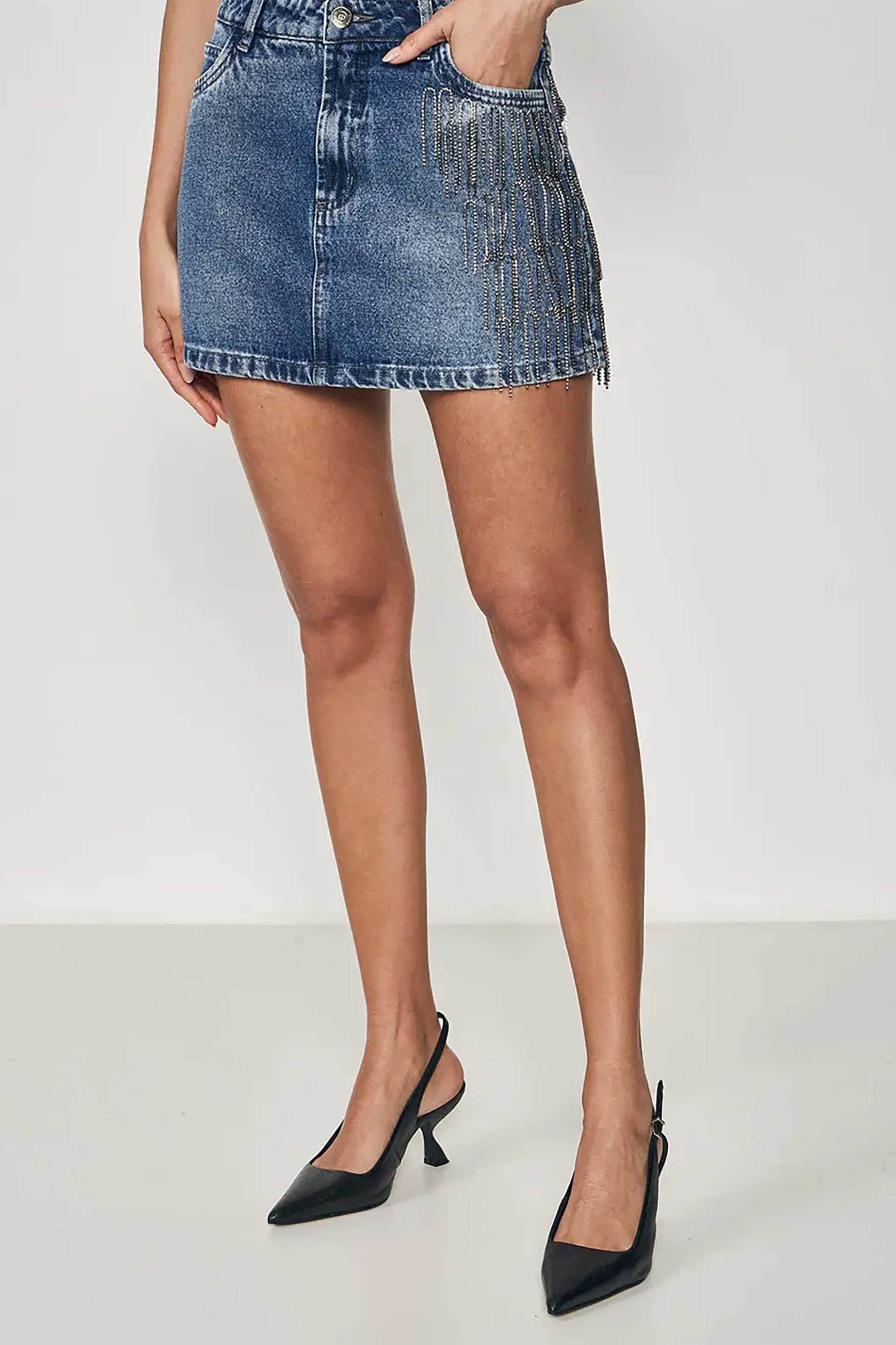 Γυναικεία mini φούστα. Denim. Σχέδιο με κρόσσια. Κλείσιμο με φερμουάρ και κουμπί. Προέλευση: Βραζιλία. 100% βαμβάκι POINT F. GROUP Α.Ε.