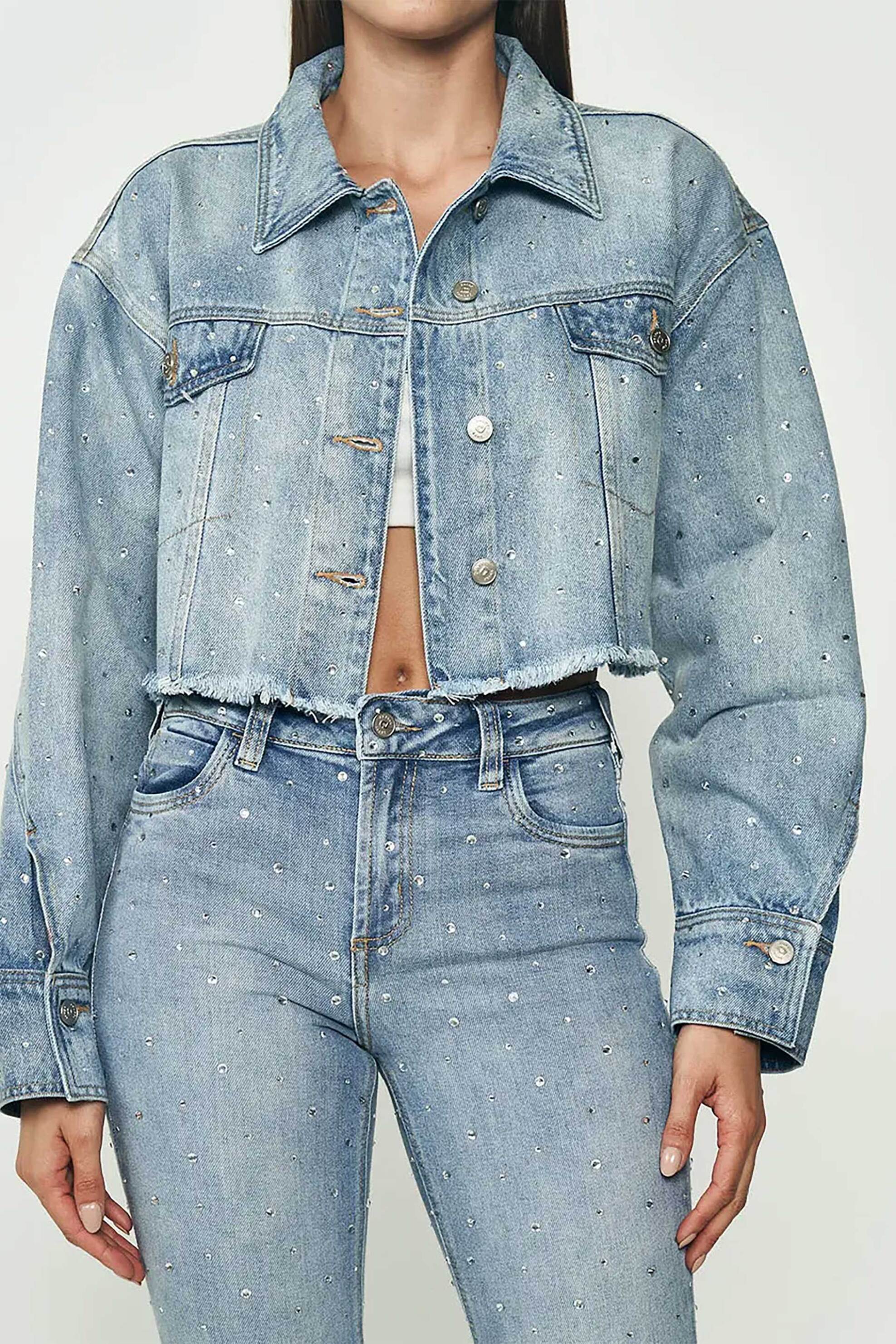 Γυναικείο μπουφάν. Denim. Στρας. Flap τσέπες στο στήθος. Κλασικός γιακάς. Κλείσιμο με κουμπιά. Cropped. Προέλευση: Βραζιλία. 100% βαμβάκι POINT F. GROUP Α.Ε.