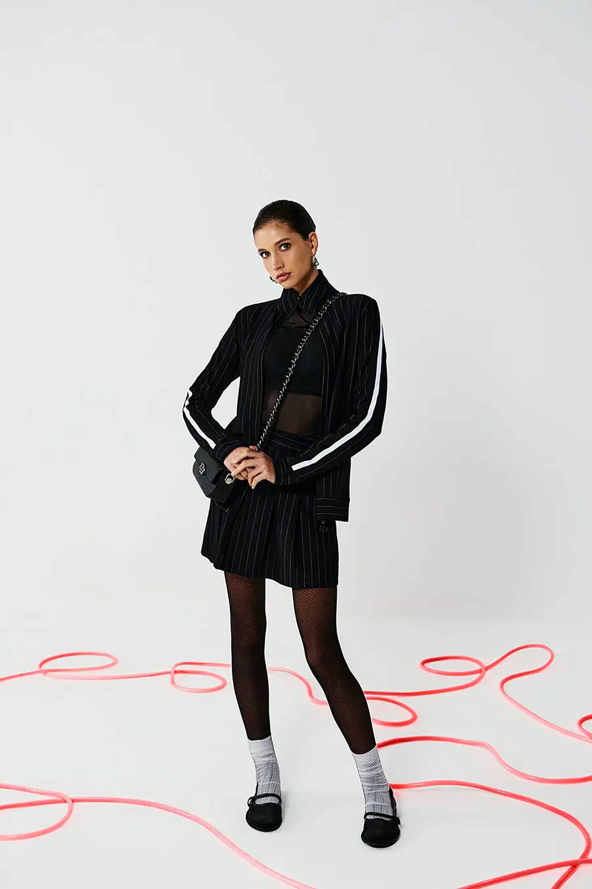 Γυναικείο jacket. Ριγέ σχέδιο. Κλασικός γιακάς. Μακρύ μανίκι. Κλείσιμο με φερμουάρ. Προέλευση: Βραζιλία. 94% βισκόζη, 5% elastane, 1% polyester POINT F. GROUP Α.Ε.
