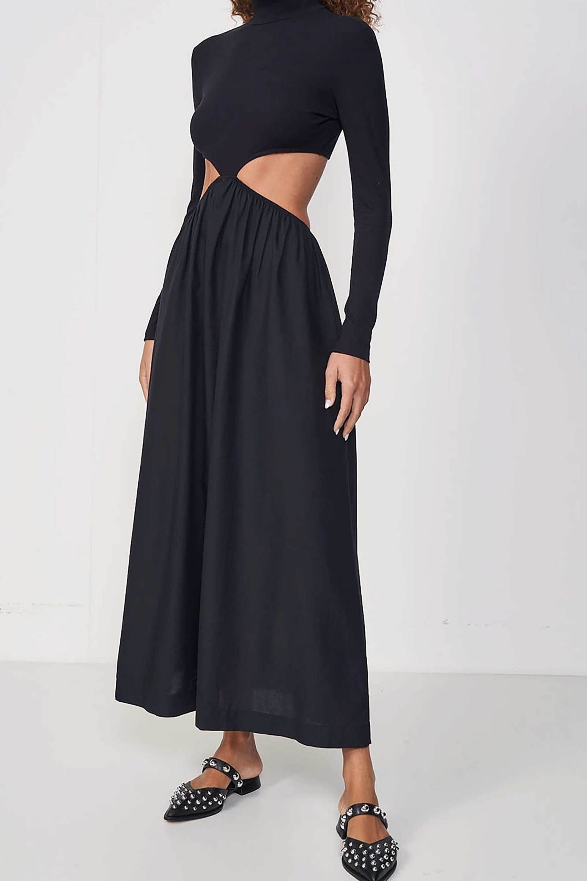 Γυναικείο maxi φόρεμα. Μονόχρωμο. Cut out λεπτομέρειες. Ψηλός λαιμός. Mακρύ μανίκι. Άνοιγμα στην πλάτη. Προέλευση: Βραζιλία. 52% βισκόζη, 29% βαμβάκι, 19% modal POINT F. GROUP Α.Ε.