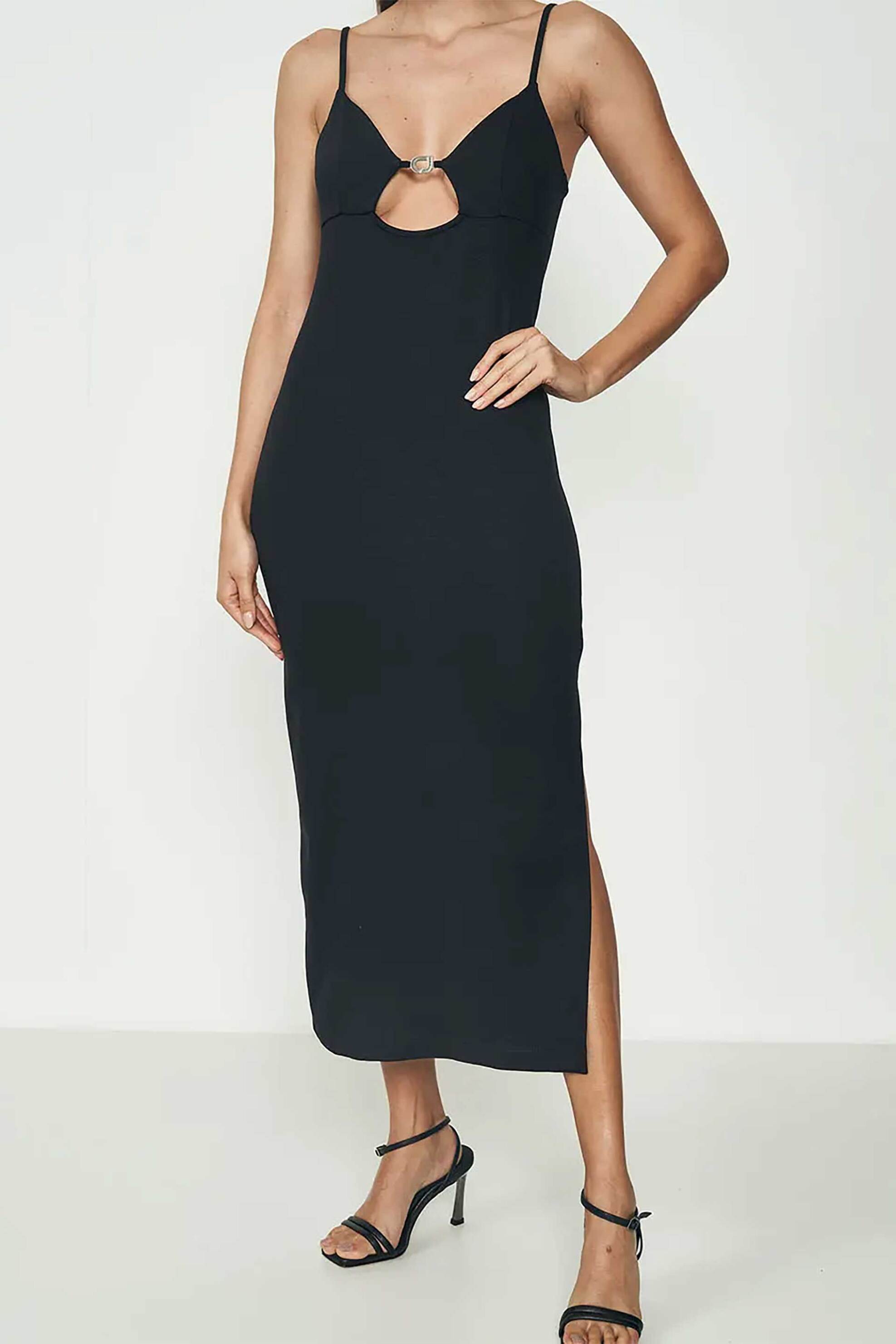 Γυναικείο midi φόρεμα. Μονόχρωμο. Αμάνικο. Cut out λεπτομέρεια. Λεπτή τιράντα. Άνοιγμα στο πλάι. Προέλευση: Βραζιλία. 94% βισκόζη, 6% elastane POINT F. GROUP Α.Ε.