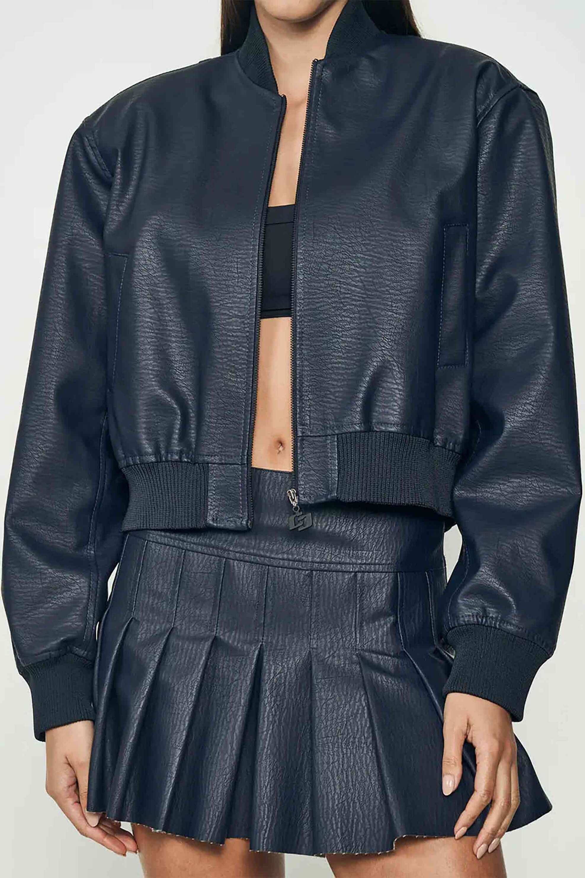 Γυναικείο μπουφάν bomber. Μονόχρωμο. Faux δέρμα. Τσέπες στο πλάι. Κλείσιμο με φερμουάρ. Ψηλός λαιμός. Προέλευση: Βραζιλία. 100% polyester POINT F. GROUP Α.Ε.