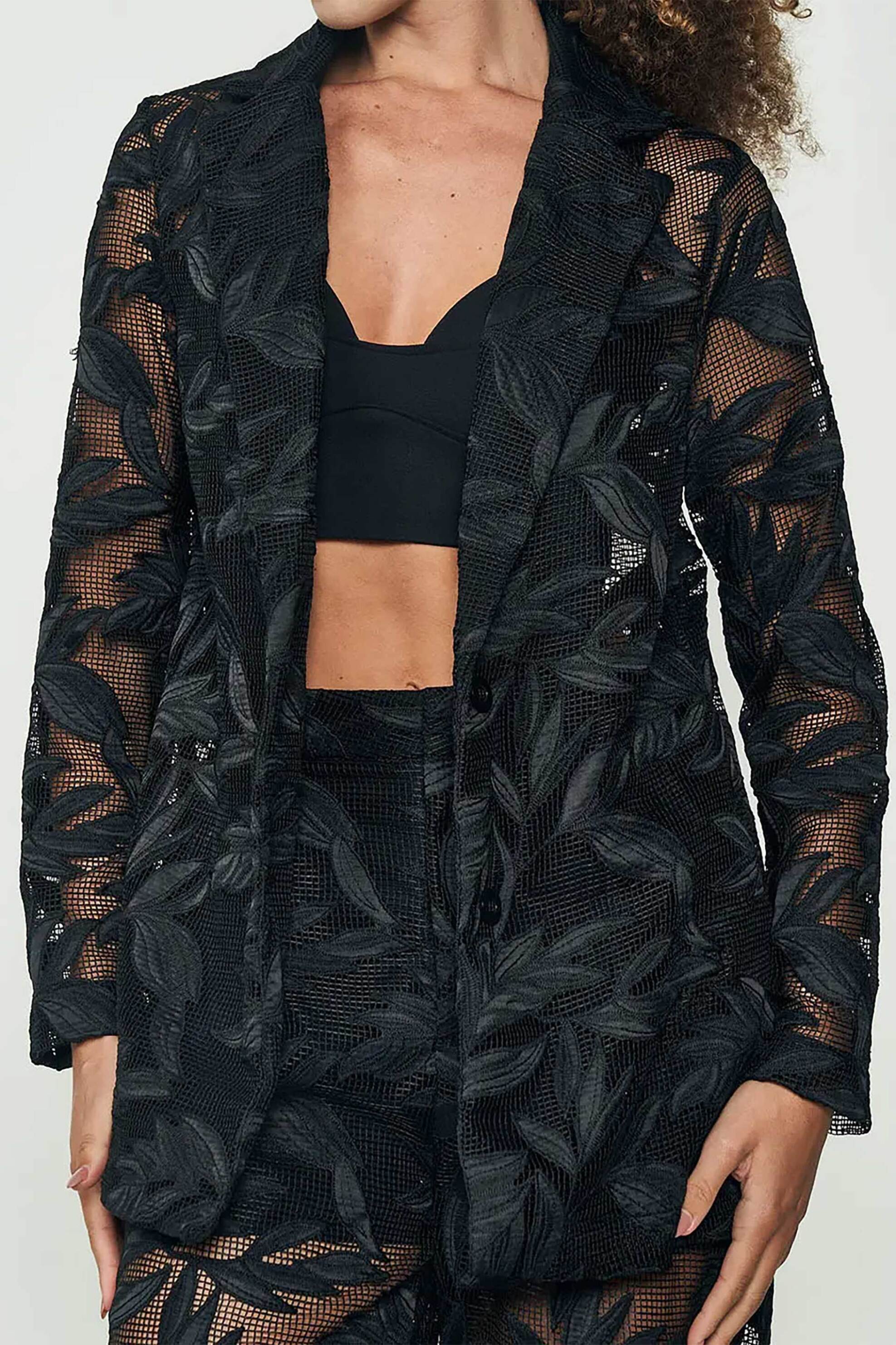Γυναικείο σακάκι. Μονόχρωμο. Κεντημένο τούλι. Floral και διάτρητο σχέδιο. Κλασικός γιακάς. Κλείσιμο με κουμπιά. Προέλευση: Βραζιλία. 100% polyester POINT F. GROUP Α.Ε.