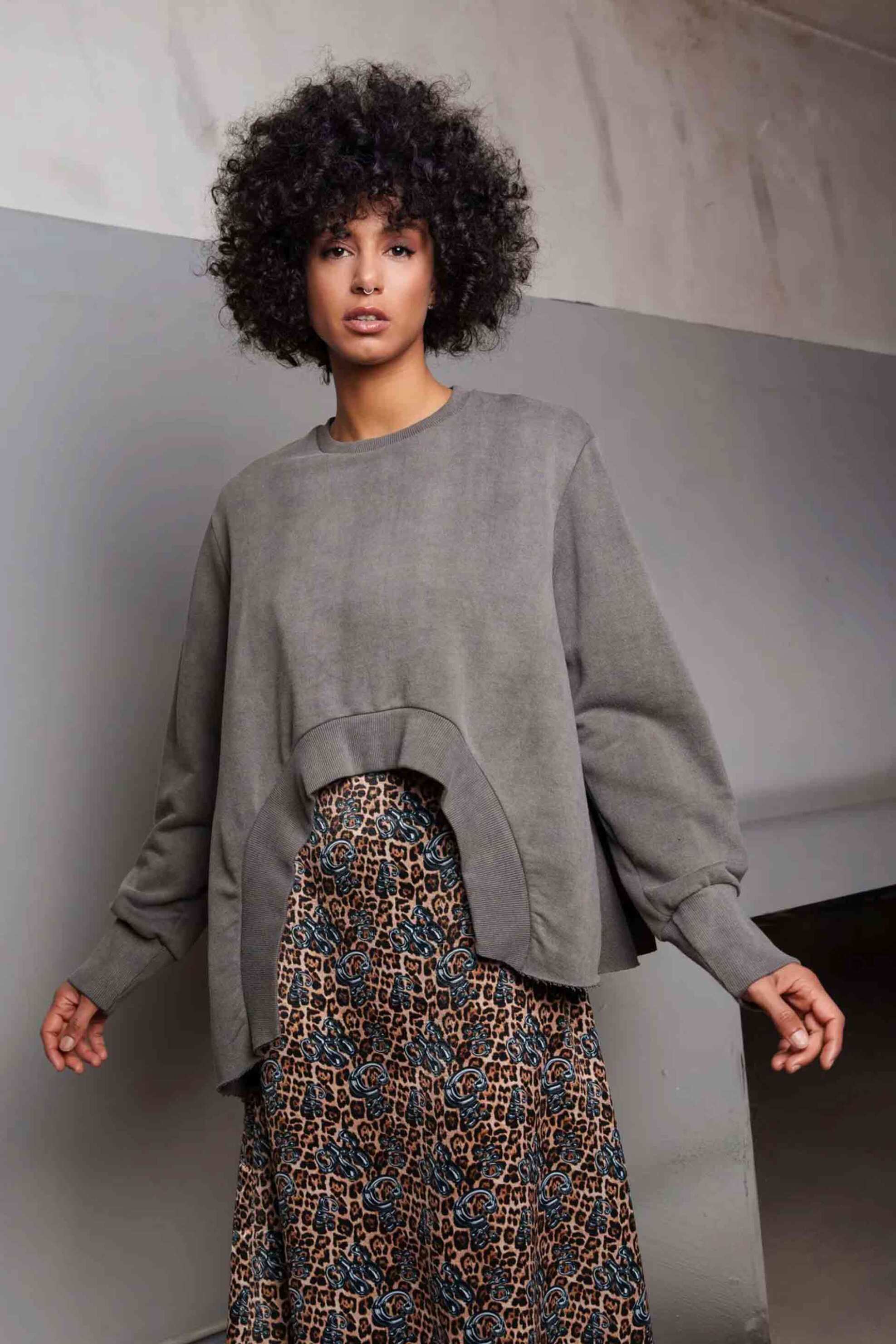 Γυναικεία μπλούζα φούτερ. Ασύμμετρο. Μακρύ μανίκι. Logo patch στο πίσω μέρος. Oversized. Προέλευση: GR. 100% washed βαμβάκι Το μοντέλο φοράει νούμερο S/Μ. ΠΑΝΤΑΖΟΠΟΥΛΟΣ Μ.& ΣΙΑ Ε.Ε.
