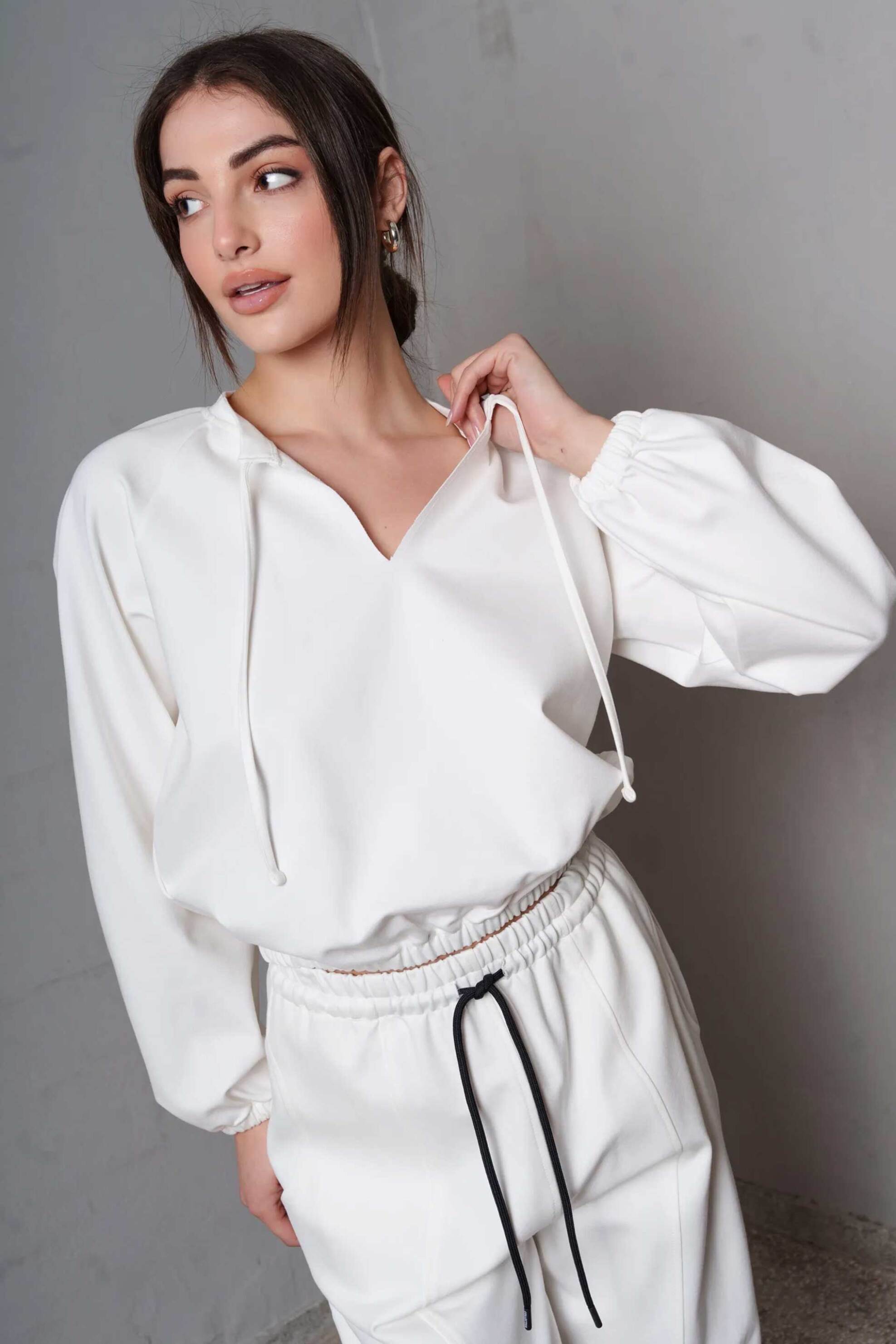 Γυναικεία μπλούζα. V λαιμόκοψη με κορδόνια. Μακρύ μανίκι με σούρες στο τελείωμα. Χαλαρή γραμμή. Προέλευση: GR. 65% rayon, 30% nylon, 5% elastane Το μοντέλο φοράει νούμερο S. ΠΑΝΤΑΖΟΠΟΥΛΟΣ Μ.& ΣΙΑ Ε.Ε.